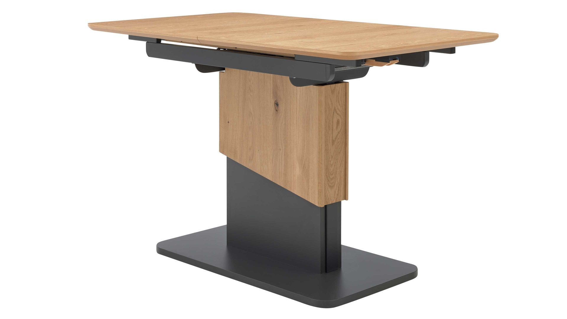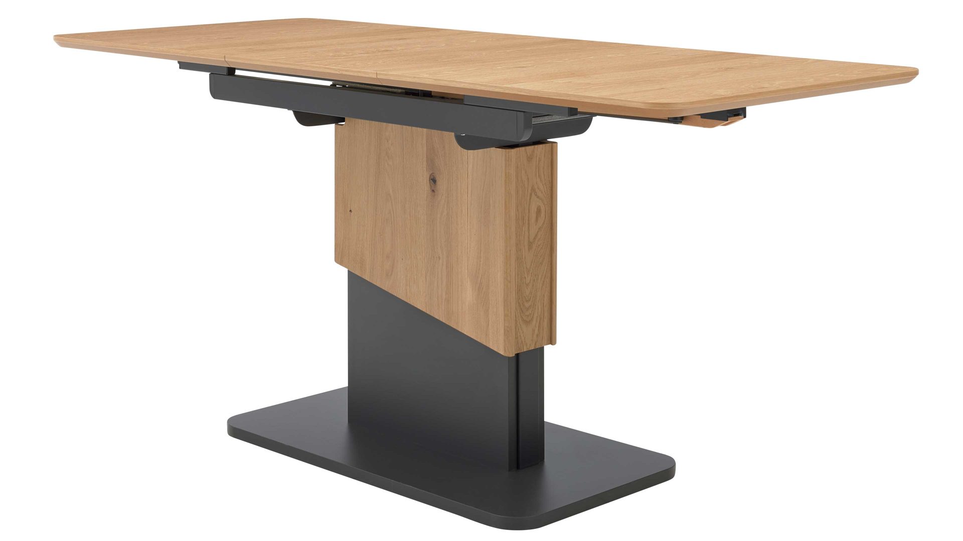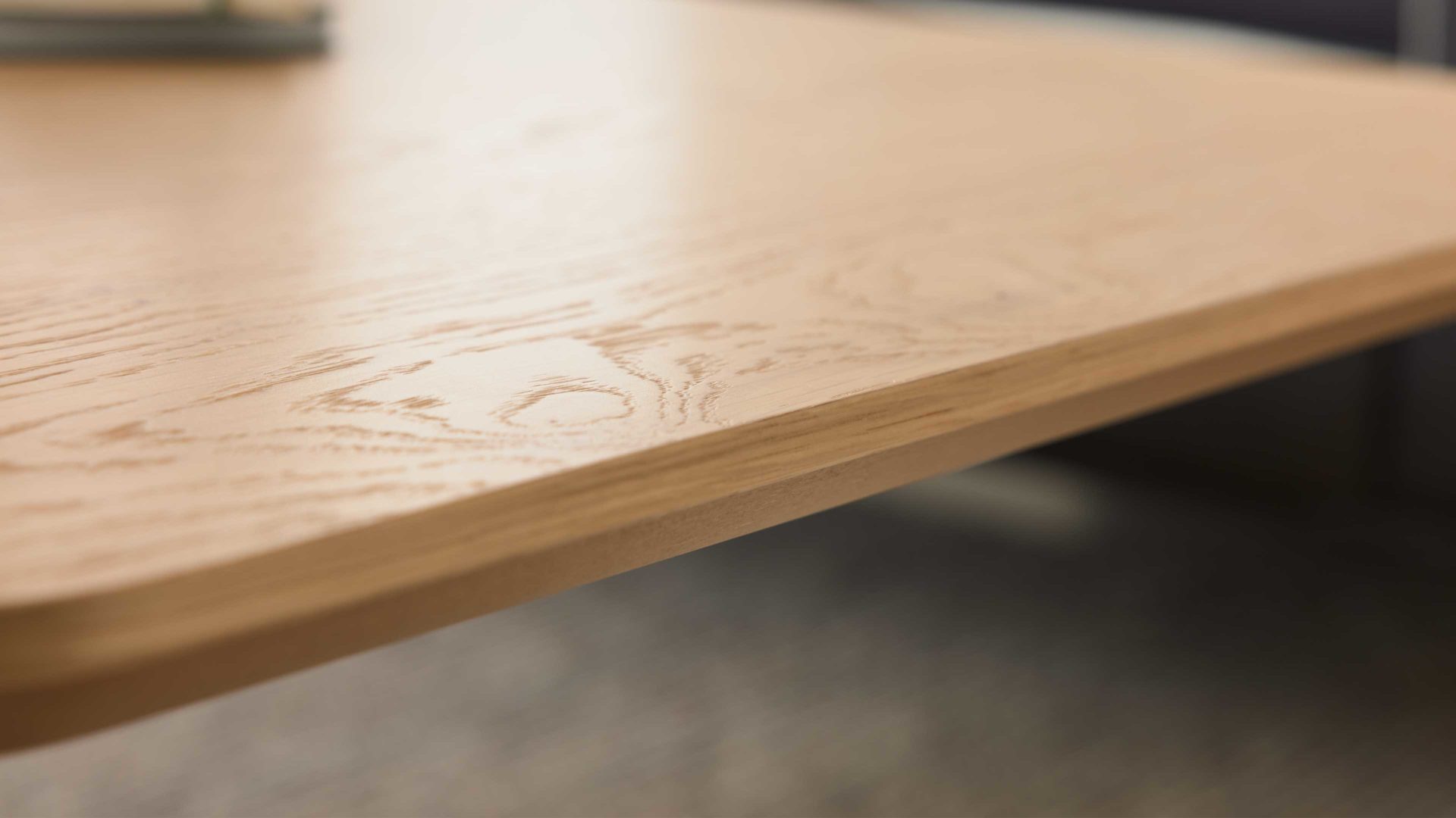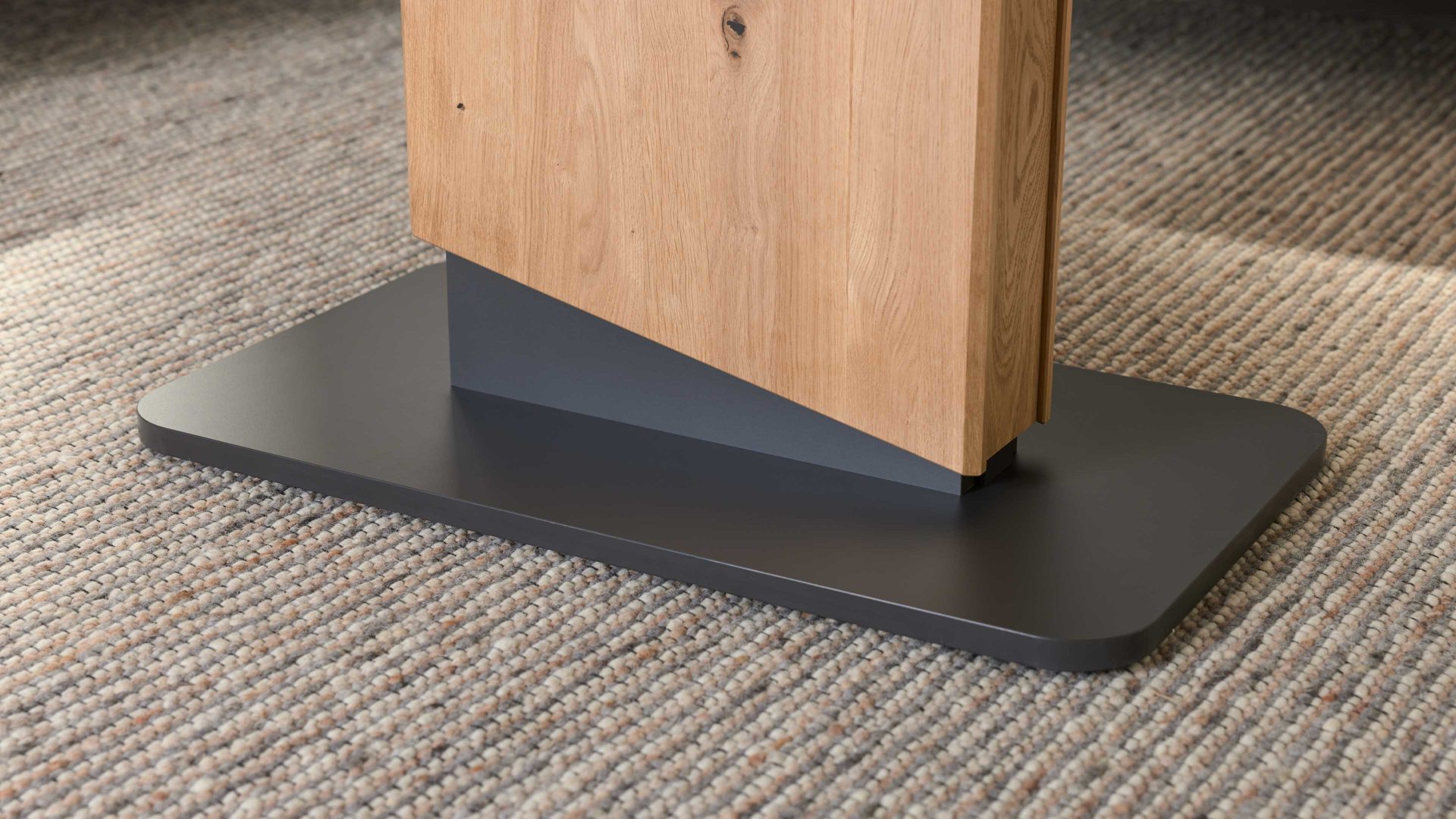 Der Hell-Dunkel-Kontrast und die natürliche Ausstrahlung der Tischplatte mit abgeschrägter Schweizer Kante verleihen ihm das gewisse Etwas.
