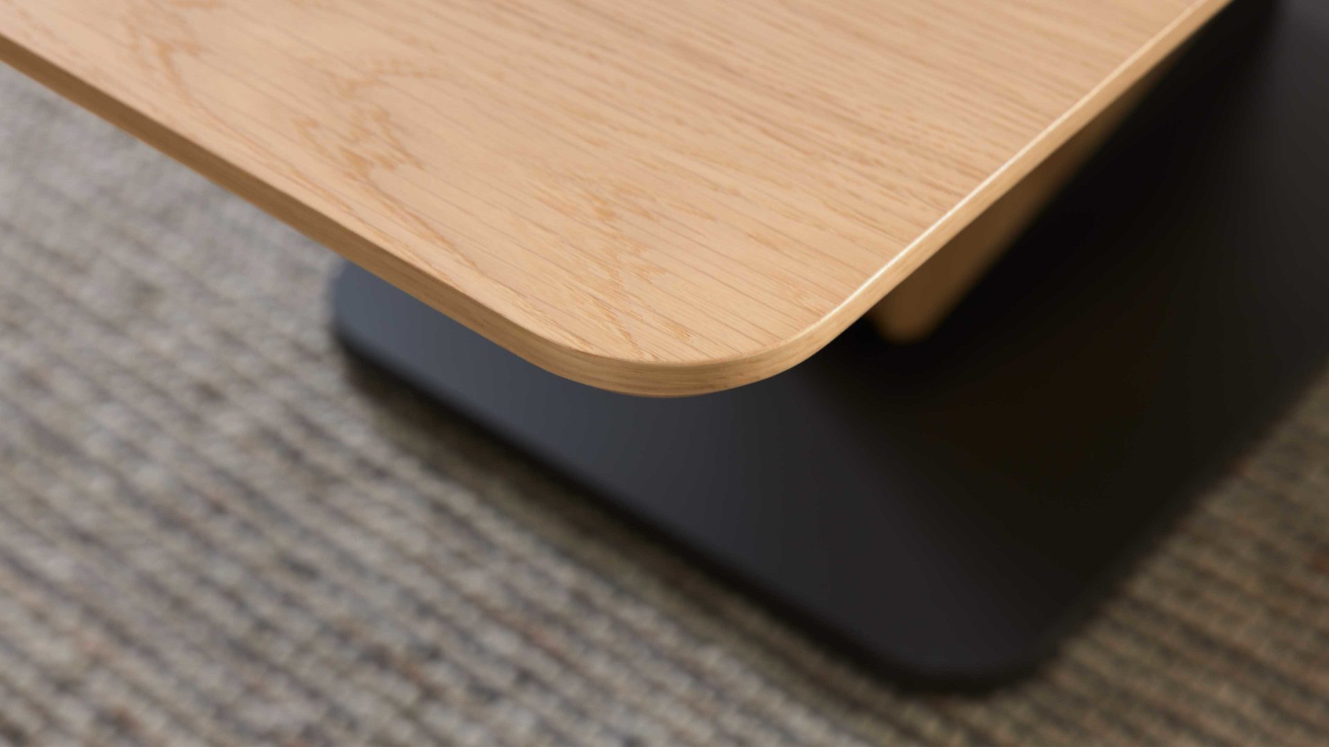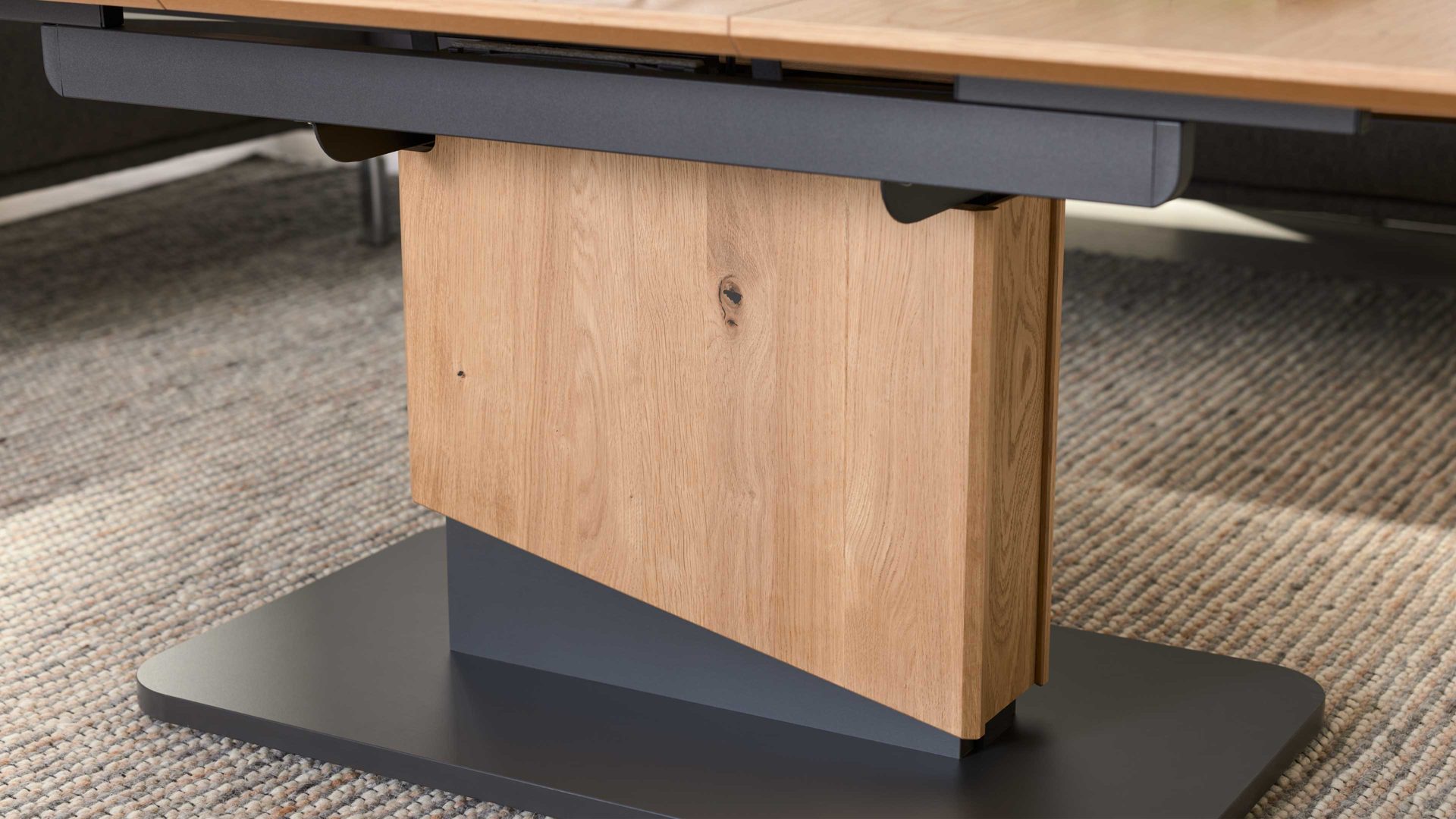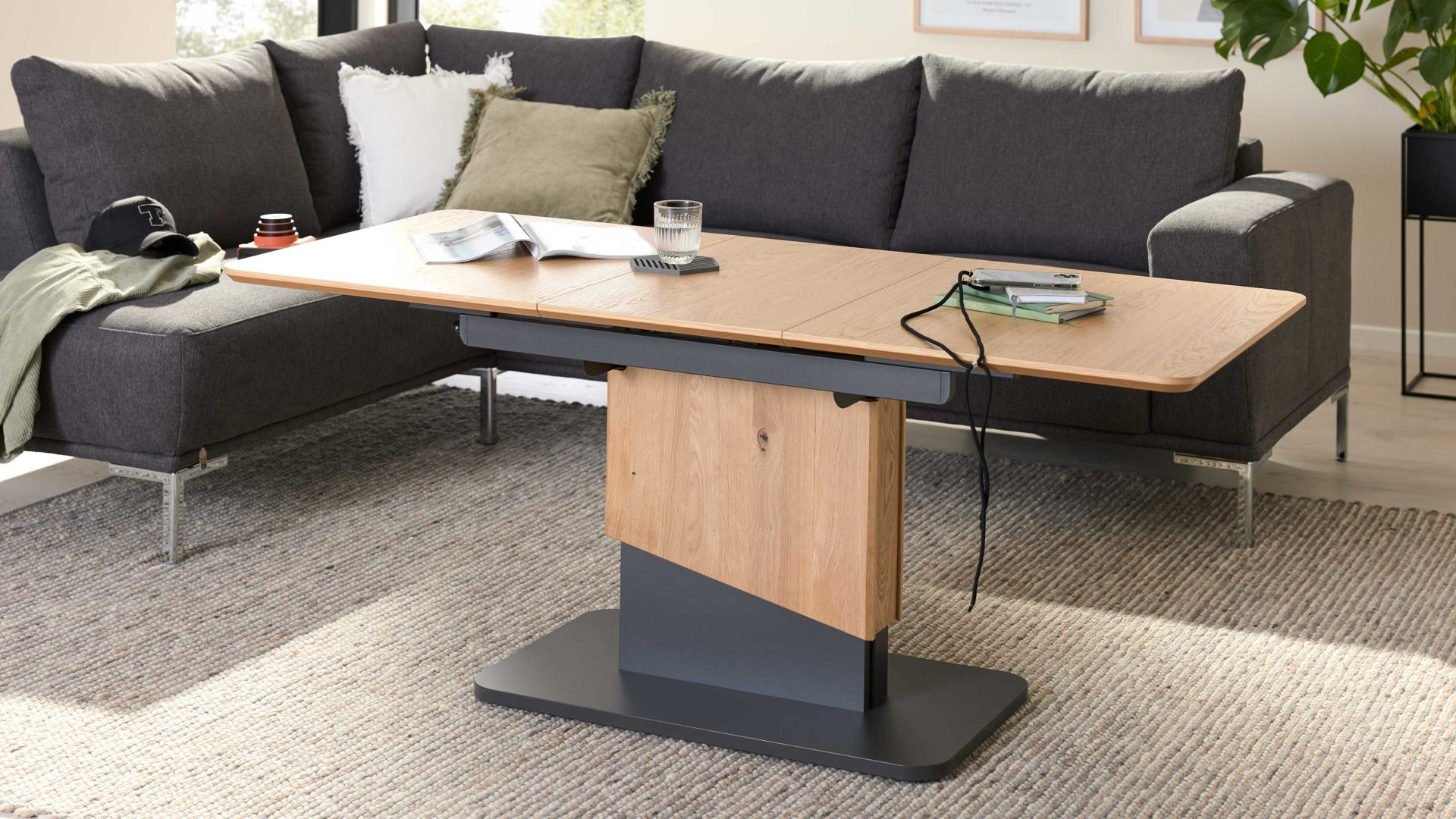 Beim Couchtisch aus der Interliving Couchtisch Serie 6223 verschmelzen hochwertiges Wildeichefurnier, graphitschwarze MDF und anthrazit-metallicfarben lackierte Metallelemente zu einem modernen, stilvollen Design.