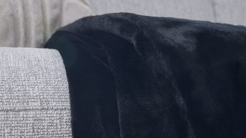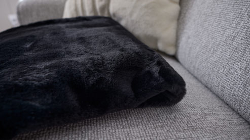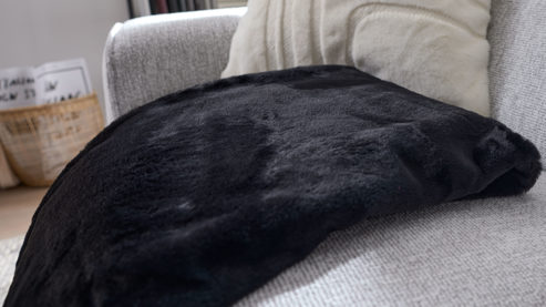 Die Vorderseite der Kuscheldecke besteht aus geschnittenem Kunstfell mit feinem, graphischem Muster – ein echter Blickfang im Wohnzimmer. Die Rückseite aus schwarzem Wirksamt begeistert mit ihrer samtigen Struktur und sorgt für ein besonders behagliches Gefühl. Diese Materialkombination verleiht der Sofadecke einen Hauch von Luxus und schafft ein warmes, elegantes Wohnambiente.