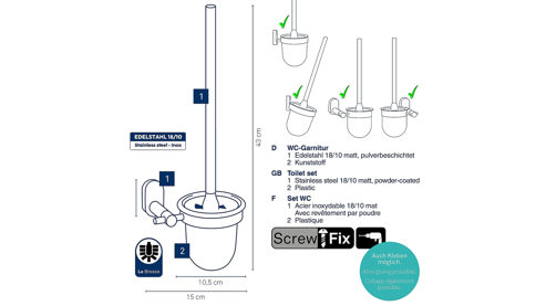 Entdecken Sie Eleganz und Funktionalität mit unserer Schwarzen Toilettengarnitur Alessio zur Wandmontage! Der Edelstahlgriff verleiht Ihrem Badezimmer eine edle Note, während der schwarze Kunststoffbecher für Sauberkeit und Stil sorgt. Die enthaltene austauschbare WC-Bürste »La Brosse« garantiert effektive Reinigung. Montieren Sie die Garnitur ganz nach Ihren Vorlieben - mit Schrauben oder dem separat erhältlichen Kleber 22755. Maße ca. 11 x 43 x 15 cm (BxHxT)