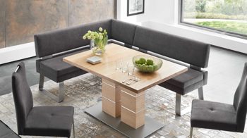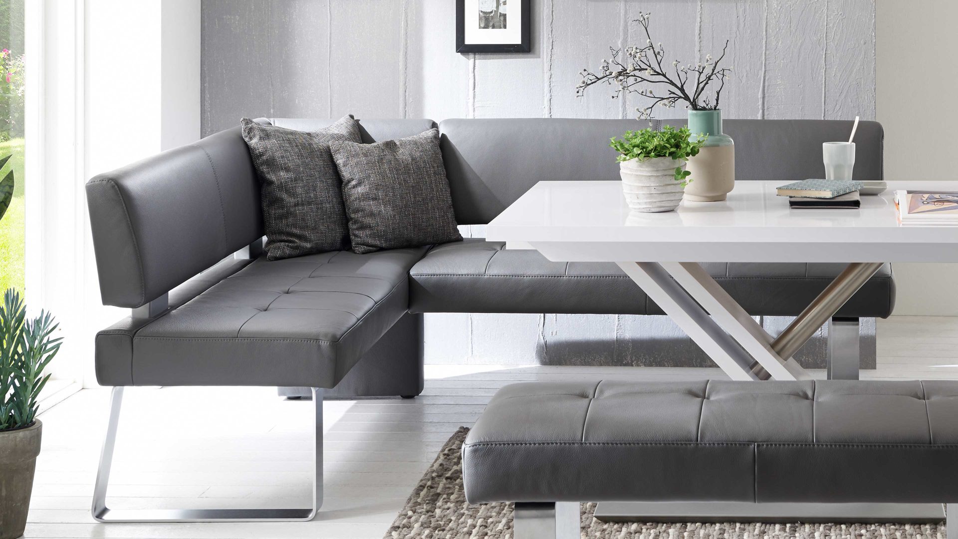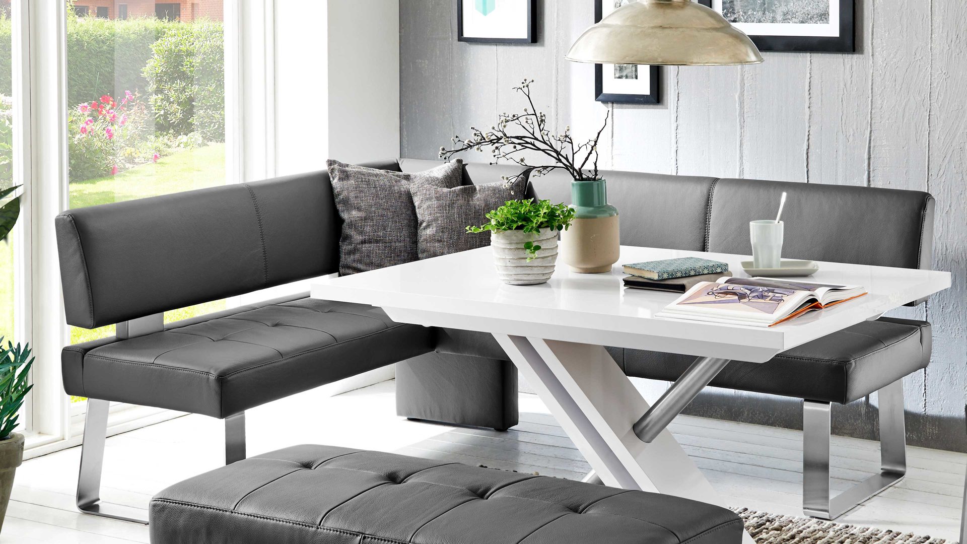 Das Gestell und der Abstandhalter im Rücken sind in Edelstahloptik gearbeitet, was das geschmackvolle Design der Sitzbank unterstreicht. Das Schenkelmaß der Polsterbank beträgt ca. 157 x 203 cm (LxB), was gleichzeitig der Stellfläche entspricht.