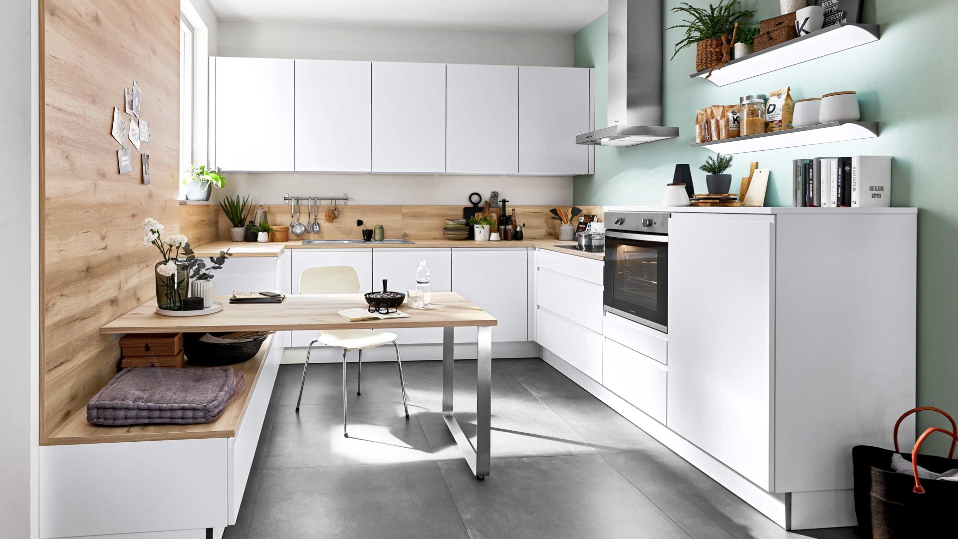 Die nolte® Einbauküche Sigma mit privileg Einbaugeräten begeistert mit den softmatt lackierten Fronten in puristischem Weiß, die teils grifflos, teils mit praktischen Griffmulden versehen sind, und den akzentuierenden Details in Kernbuche-Nachbildung, die warmes Flair verströmen.