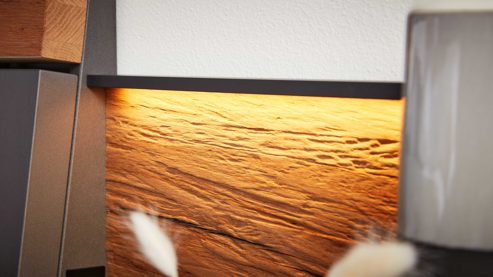 Alle Schranktüren bieten dir Schließdämpfung, die Schubladen komfortablen Selbsteinzug für leises, sanftes Schließen. Optional kannst du eine edle LED-Beleuchtung ergänzen, die dem Raum eine warme Atmosphäre verleiht.