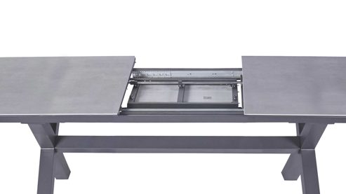an der Stirnseite wird die Tischplatte mit einem Butterfly-Auszug ausgezogen, um die Tischfläche mit innenliegenden Platten zu vergrößern