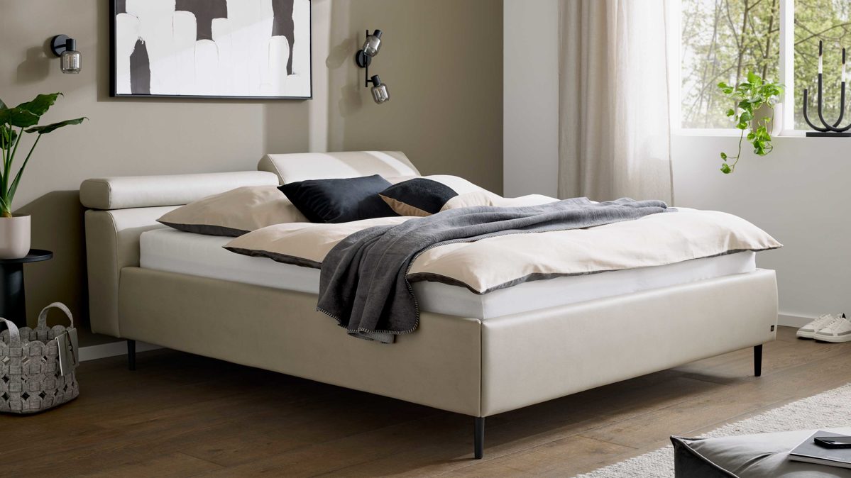 Mit dem Interliving Polsterbett Serie 1422 holst du dir ein stilvolles Bettgestell ins Schlafzimmer, das modernes Design, Komfort und flexible Ausstattung gekonnt verbindet. Der hellgraue Stoffbezug verleiht dem Polsterbett eine ruhige, wohnliche Ausstrahlung, während die schwarzen Metallfüße mit ihrer nach hinten versetzten Montage für die elegante, fast schwebende Optik sorgen. Gerade wenn du ein hochwertiges Polster-Bettgestell, ein bequemes Doppelbettgestell oder ein zeitloses Bett mit klarer Linienführung suchst, setzt dieses Modell einen starken Akzent.