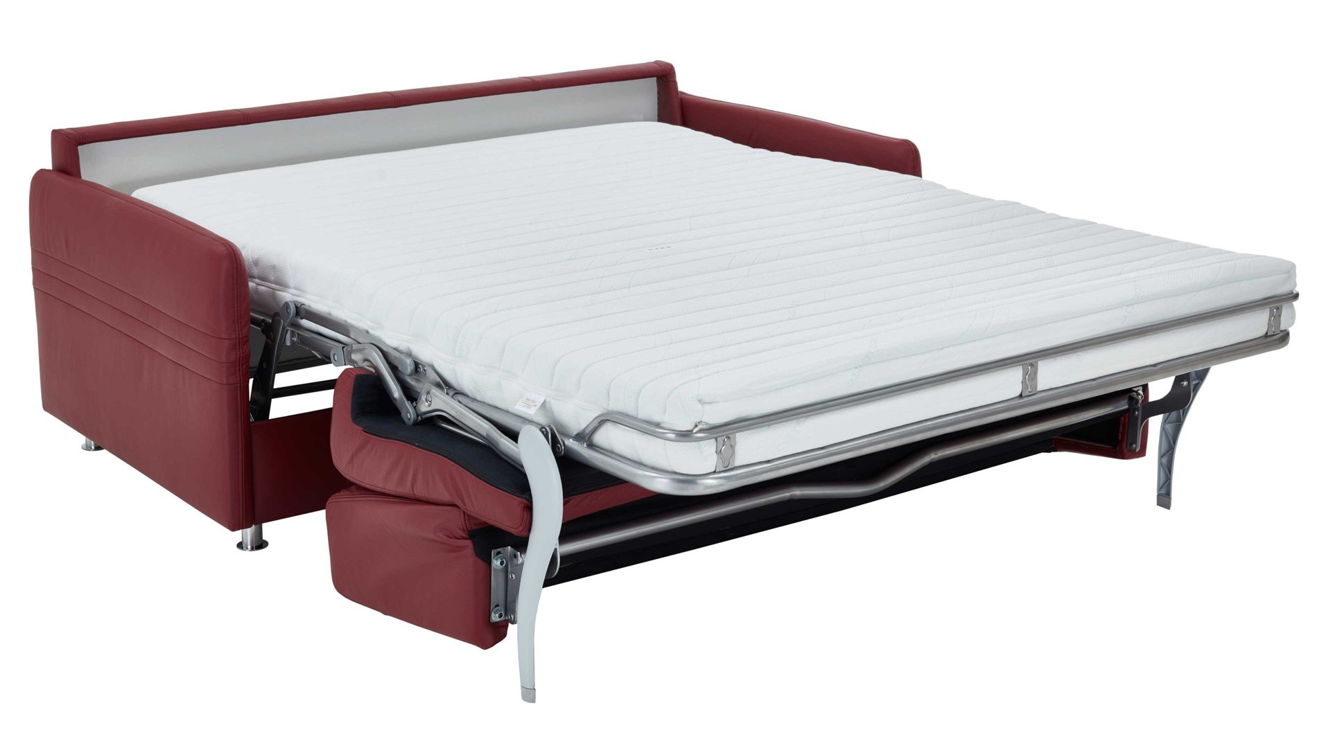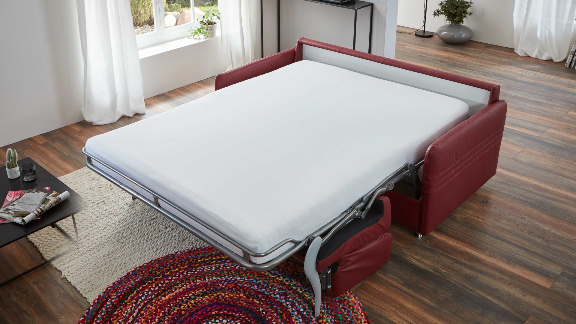 Nutzen Sie den Platz in Ihrem Wohnzimmer optimal aus mit diesem praktischen Comfortmaster Funktionssofa Messina. Das Polstermöbel bietet Ihnen eine gekonnte Mischung aus tollem Design und hoher Funktionalität und ist damit unverzichtbar in Ihrem Gästezimmer. Stellen Sie die Couch in Ihren Wohnbereich und erfreuen Sie sich täglich an dem Bezug aus dunkelrotem Leder und den Chromfüßen. Mit Maßen von ca. 157 x 84 x 100 cm (BxHxT) fügt sich das Verwandlungssofa hervorragend auch in kleinen Räumen ein. So betten Sie Ihre Gäste äußerst komfortabel auf der Liegefläche von ca. 120 x 200 cm (BxL).