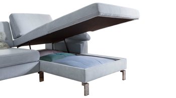 Die gesamte Sitzfläche der Recamiere des SOFAkultur Ecksofas SK 239 lässt sich nach oben aufklappen.