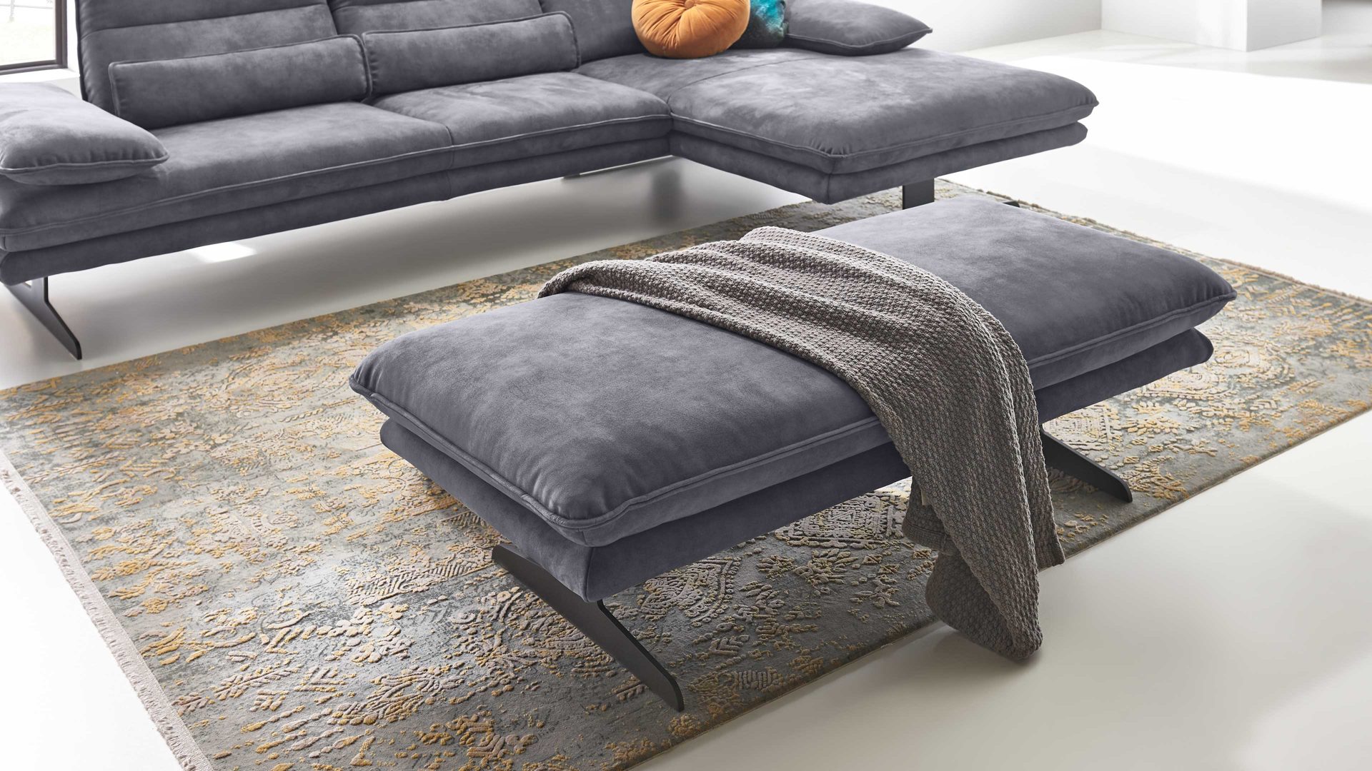 Der moderne Polsterhocker aus der W.SCHILLIG Polsterserie Broadway bringt luxuriöses Flair und vor allem jede Menge Komfort in Ihr Wohnzimmer. Optisch begeistern der elephantgraue Stoffbezug mit Biese sowie die mattschwarz pulverbeschichteten Metall-Kufenfüße, deren filigrane Umsetzung dem Hocker eine leichte und offene Ausstrahlung verleiht. Die Farben sind perfekt aufeinander abgestimmt.