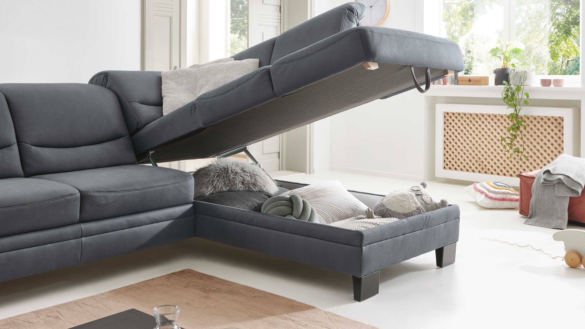 Bei der Aufklappfunktion handelt es sich um einen praktischen Funktions-Mehrpreis für die Kombielemente aus dem Modulmaster-Polsterprogramm MM-PP1133. Der manuell aufklappbare Stauraum ist innen weiß beschichtet und belüftet. Er eignet sich zum Verstauen verschiedener Wohntextilien, aber auch zur Aufbewahrung von Spielzeug und sonstigen Gegenständen.