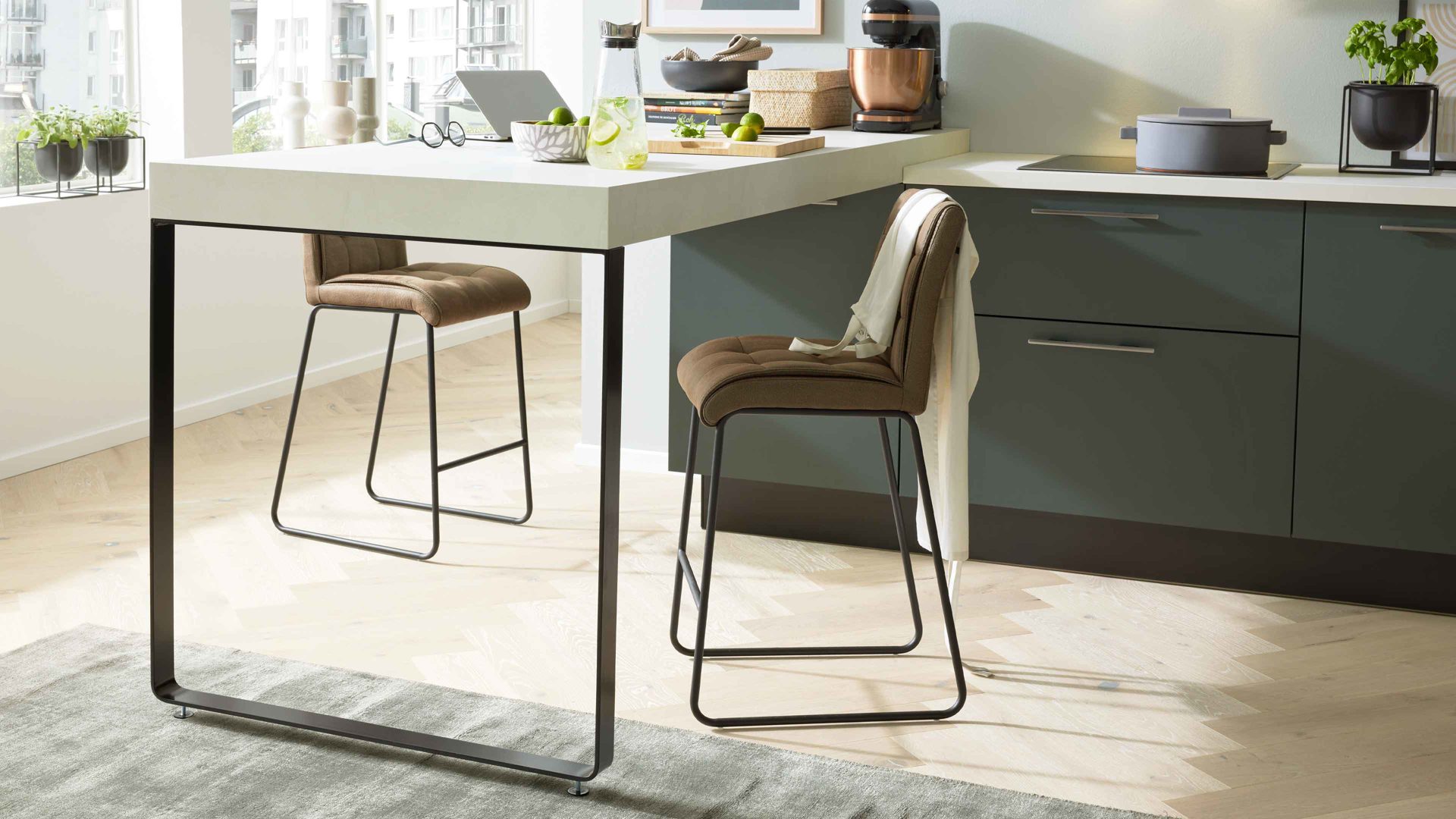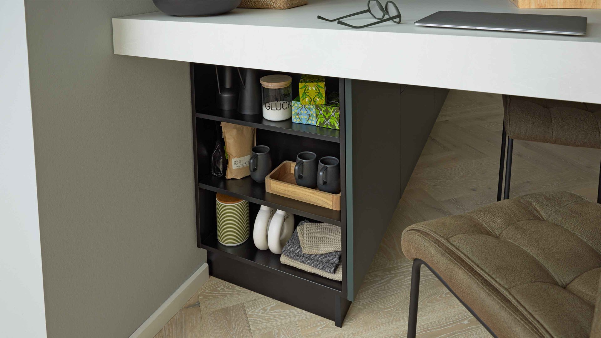 Die Interliving Küche Serie 3059 vereint matte schwarzgrüne Fronten mit einem quarzgrauen Korpus und titanfarbenen Metallgriffen. Einen besonderen Akzent setzen die Platten in weißer Marmor-Nachbildung, die der Küche eine exklusive Note verleihen. Schwarze Sockelblenden runden das modern-elegante Gesamtbild perfekt ab.