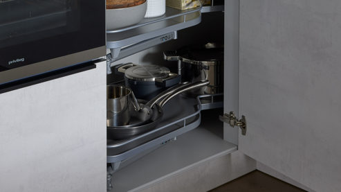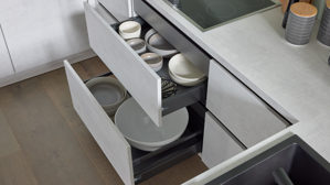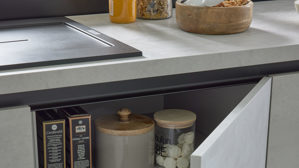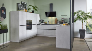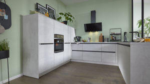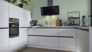 Die Interliving Küche Serie 3080 bietet modernes Küchendesign mit klaren Linien und funktionalen Details. Die Fronten in weißer Beton Nachbildung werden durch mattes Platingrau und mattschwarze Griffleisten stilvoll ergänzt. Das Ergebnis ist ein edler Materialmix mit urbanem Charakter – perfekt für eine moderne Küchenarchitektur.