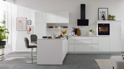 Die Interliving Küche Serie 3089 kombiniert klare Linien, hochwertige Materialien und viel Stauraum auf ca. 480 cm Länge inklusive Hängeschränken und ca. 220 cm Tiefe. Mattweiße Melaminfronten, weiße Korpusse und Arbeitsplatten in Marmor Bianco Nachbildung erzeugen einen hellen, modernen Look.