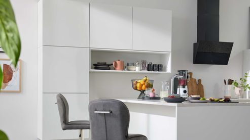 Auf der rechten Küchenzeile erwarten dich das Kochfeld, eine kopffreie Dunsthaube sowie Unterschränke mit Auszügen und Fronten mit Griffmulden. Zwei Geräteschränke integrieren Backofen und Kühlschrank ergonomisch und ordentlich.