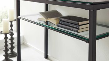 Mit ca. 100 × 75 × 38 cm (B/LxHxT) ist dieser rechteckige Konsoltisch die ideale Ergänzung für unterschiedlichste Wohnbereiche. Die schlanke Form verleiht dem Möbel eine elegante Leichtigkeit, während die untere Glasablage Platz für Magazine, Bücher oder dekorative Accessoires bietet – perfekt, um dein Zuhause stilvoll und aufgeräumt zu gestalten.