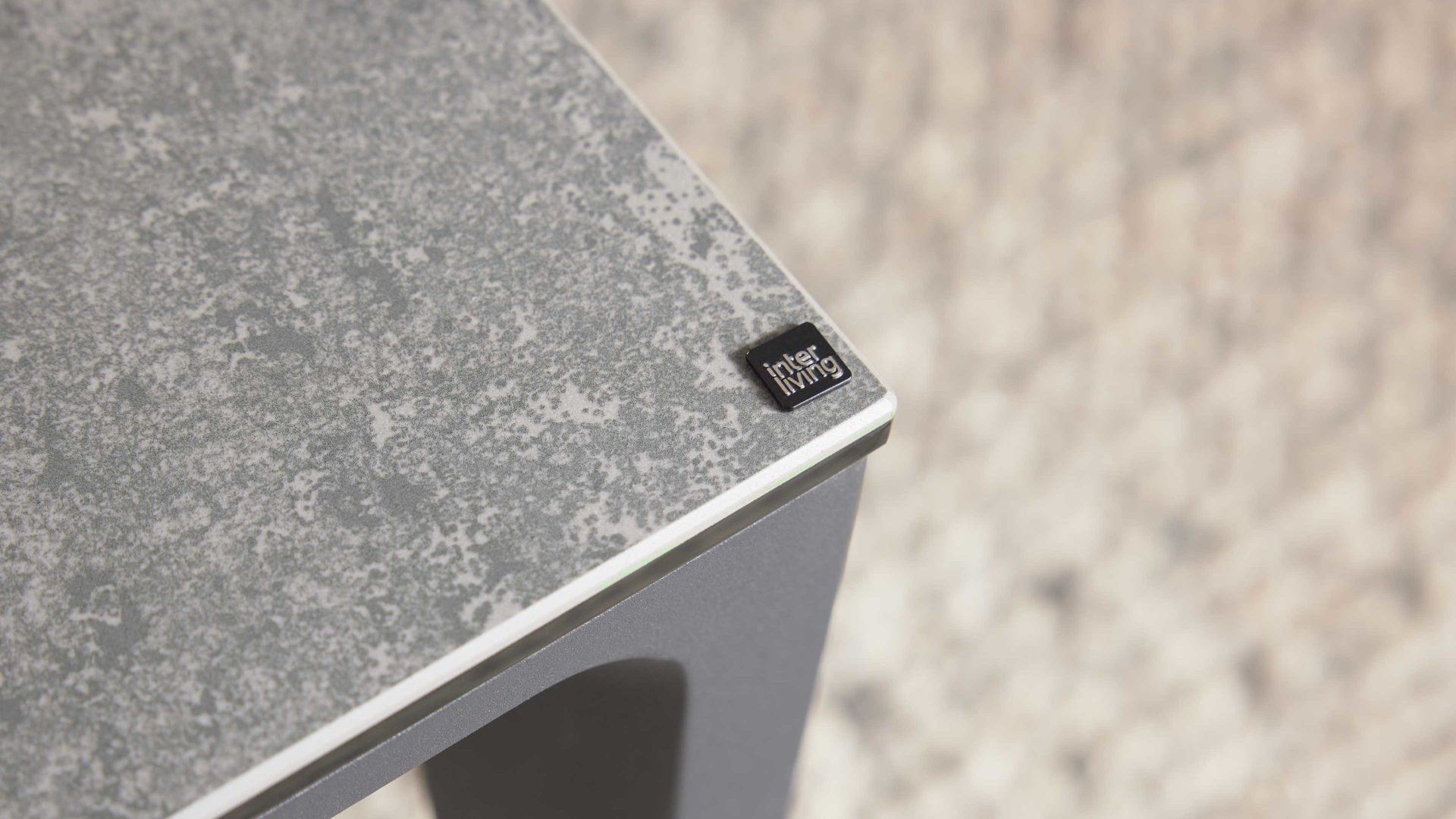 Die elegante Tischplatte kombiniert eine silbergraue Keramikplatte mit einem mattschwarz lackierten Stahlgestell.