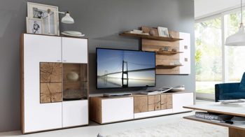 Links befindet sich eine Tür mit Mattglas und den zwei Hirnholz-Applikationen und rechts eine Mattglastür mit Klarglas-Ausschnitt. Hinter diesem Ausschnitt kommen schöne Dekoelemente besonders gut zur Geltung. Der linke Bereich beherbergt vier Holzböden, der rechte einen Holz- und einen Glasboden. Auf ca. 89 x 138 x 39 cm (BxHxT) belaufen sich die Maße des trendigen Stauraumschranks. Optional können Sie die Vitrine mit einer stimmungsvollen LED-Beleuchtung ergänzen.