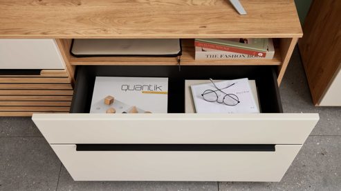 Vormontierte Korpusse erleichtern den Aufbau, Türen mit Schließdämpfung und Schubladen mit Soft-Einzug sorgen für leises und sanftes Schließen. Vierfach höhenverstellbare Einlegeböden bieten maximale Flexibilität bei der Innenaufteilung. Der umfangreiche Typenplan ermöglicht zudem individuelle Kombinationen, um deine Wohnwand perfekt auf deinen Raum abzustimmen.