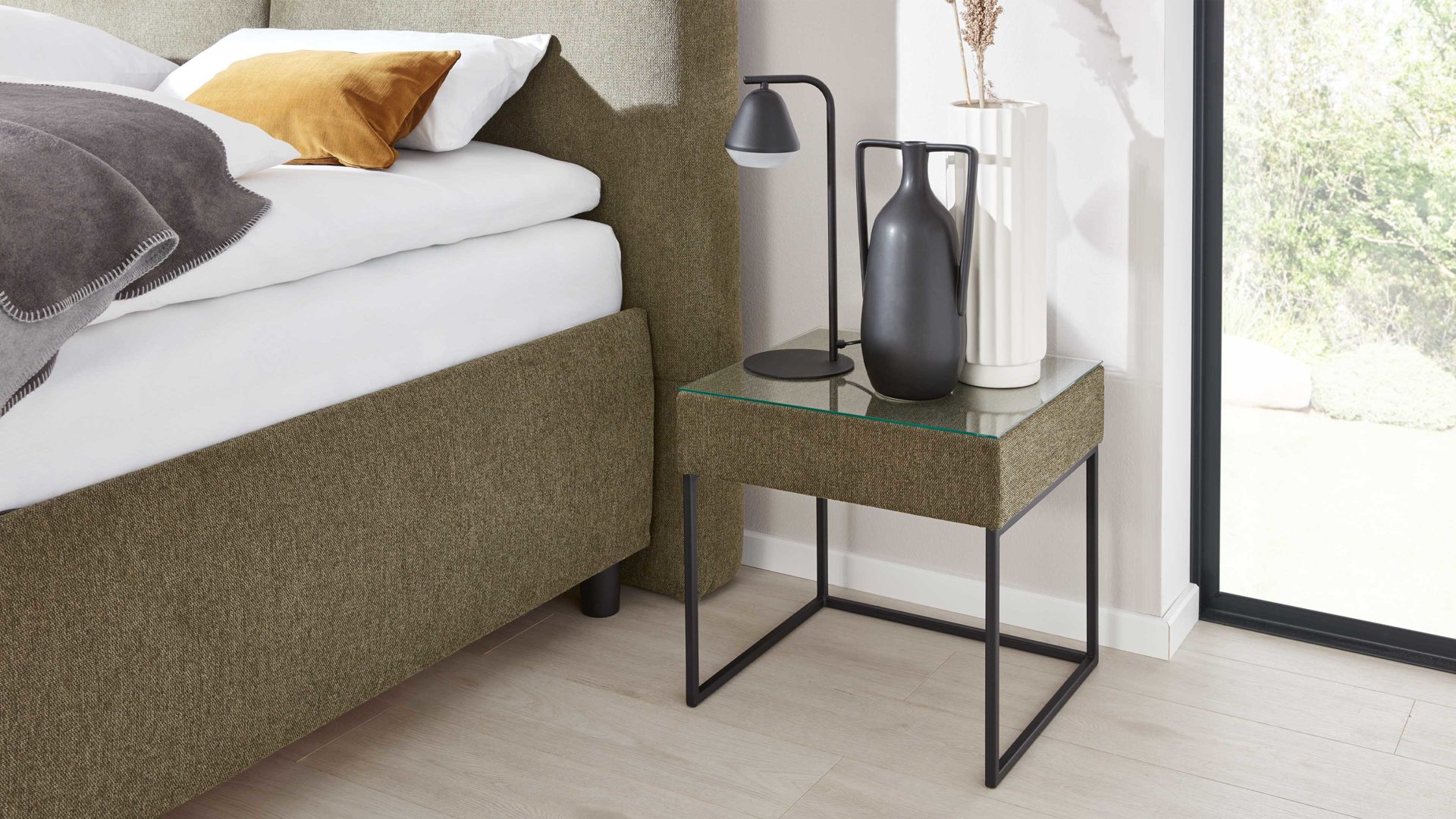 Die Nachtkonsole (Typ Ilyanka) aus der Interliving Bettsystem Serie 1414 vereint moderne Eleganz, funktionale Gestaltung und hochwertige Materialien. Der olivgrüne Stoffbezug bringt warme, natürliche Akzente in Ihr Schlafzimmer, während die mattschwarzen Metallkufen für einen spannenden Kontrast sorgen. Das Ergebnis ist eine Nachtkonsole mit schwebender, leichter Optik, die sich perfekt in moderne Wohnkonzepte einfügt.