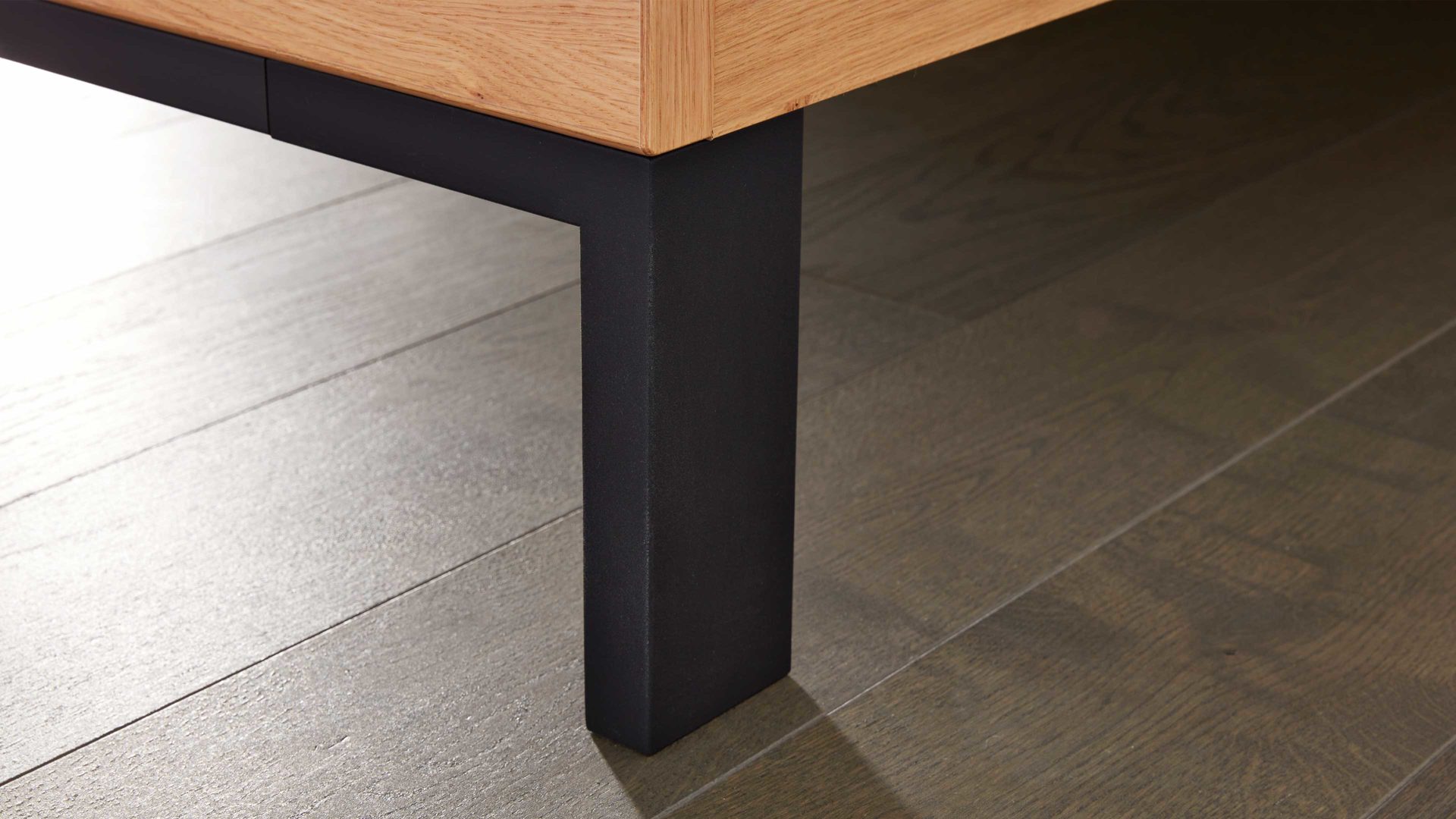 Das warme Echtholz-Balkeneichefurnier des Doppelbettgestells sorgt für eine gemütliche Atmosphäre, während die anthrazitfarbenen Metall-Winkelfüße und Zierleisten dem Bett einen modernen, stabilen Look verleihen.