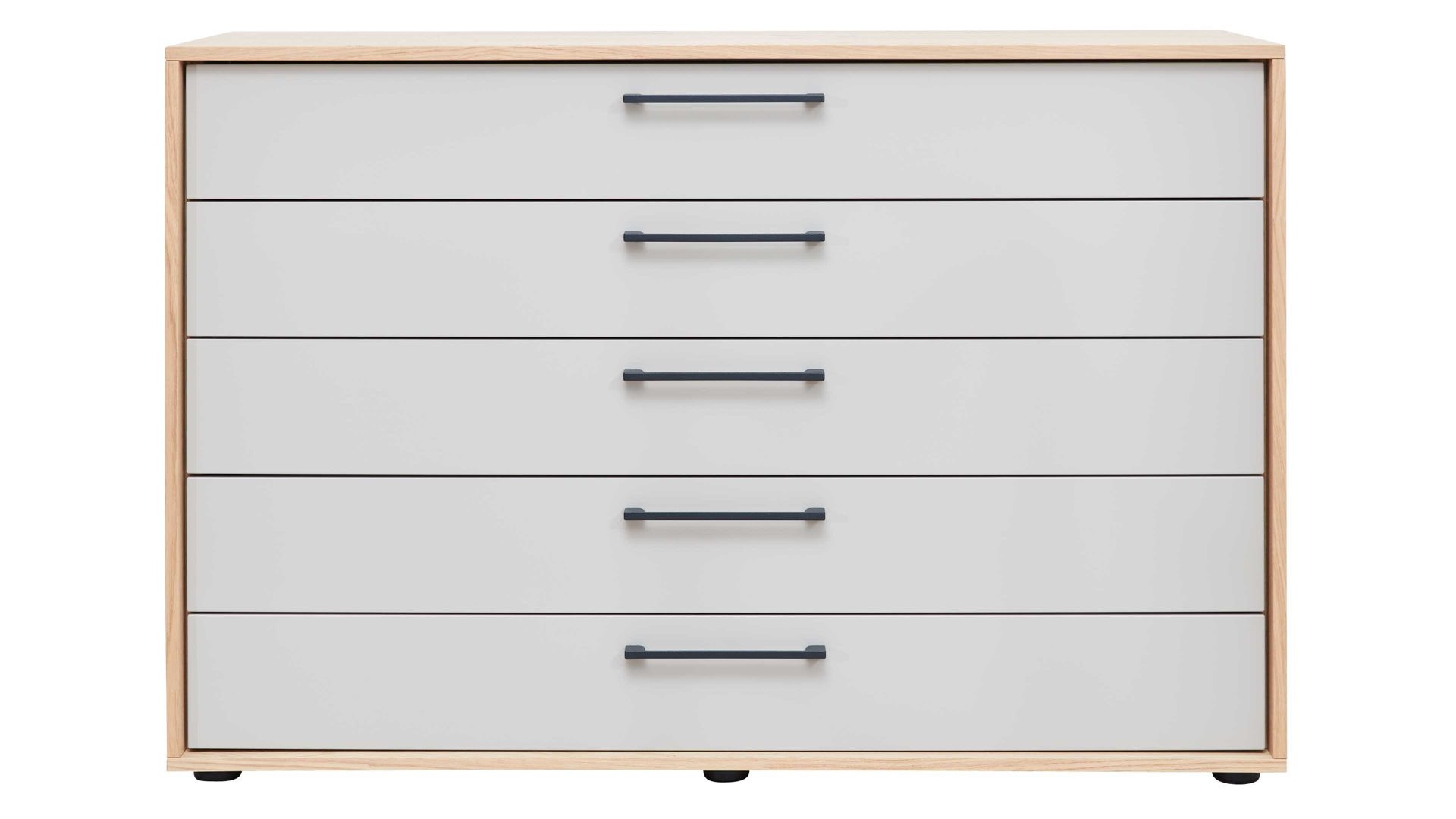Gestaltet in hellem Echtholz-Balkeneichefurnier und weißem Mattlack, verströmt die Schubladenkommode 55006