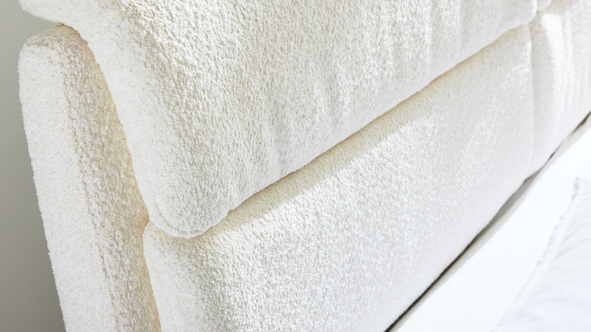 Ein echter Blickfang ist das bodenfreie Polsterkopfteil, das mit seiner filigranen Formgebung und der dezenten Kappnaht die elegante Linienführung des Bettes unterstreicht. Es dient nicht nur als ästhetisches Element, sondern auch als bequeme Rückenlehne – ideal zum Lesen, Entspannen oder Frühstücken im Bett. Auf Wunsch kann das Kopfteil mit einer Rückseite im Originalstoff bezogen werden, sodass es auch frei im Raum platziert werden kann.