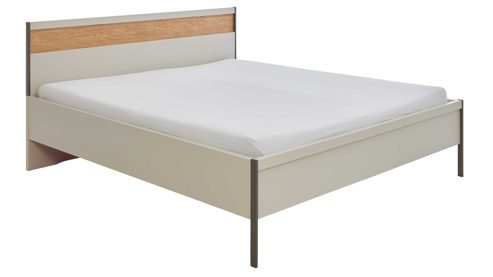Das Bettgestell überzeugt mit champagnerfarbenen Bettseiten und einem Kopfteil mit massiver Riffholzeinlage, die einen natürlichen und hochwertigen Akzent setzt. Die schieferfarben lackierten Metallfüße verleihen dem Bett eine moderne Leichtigkeit und sorgen gleichzeitig für Stabilität.