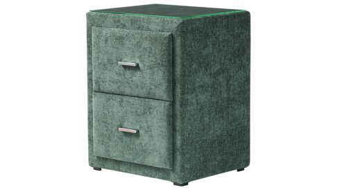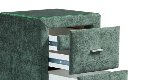 Der moosgrüne Chenillebezug verleiht der Nachtkonsole eine warme, wohnliche Ausstrahlung und sorgt gleichzeitig für eine angenehme Haptik. Die elegante Klarglasauflage setzt einen modernen Akzent und schützt die Oberfläche – ideal für Lampe, Bücher oder dein Smartphone.