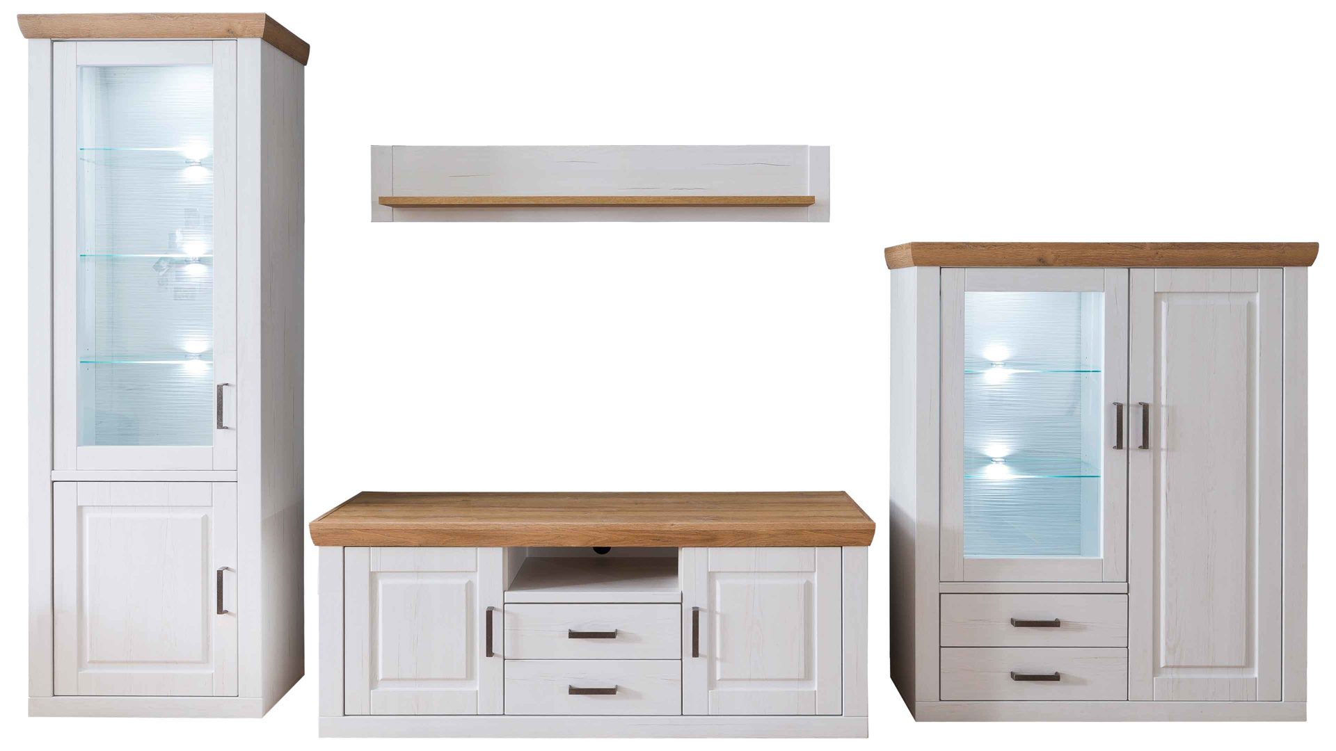 Die vierteilige Wohnkombination besteht aus einer Standvitrine, einem Lowboard, einem Wandboard und einer Highboard-Vitrine. Hier die wichtigsten Eigenschaften der einzelnen Wohnmöbel im Überblick: