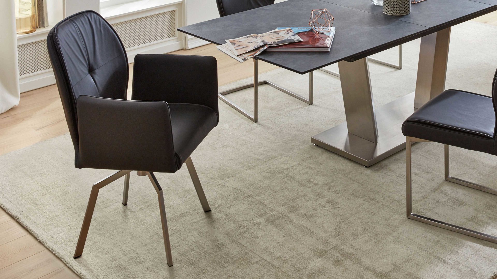 Wähle zwischen schwarz pulverbeschichtetem Metall oder gebürstetem Edelstahl – jeweils mit oder ohne Dreh- und Rückstellmechanismus. Entscheide dich für eine Sitzschale mit oder ohne Armlehne und eine von drei attraktiven Steppungen, um deinen persönlichen Stil perfekt zu unterstreichen. Die Serie bietet dir vier hochwertige Lederfarben und acht moderne Mikrofaserfarben – perfekt auf die stilistischen Möglichkeiten zeitgemäßer Esszimmer abgestimmt.