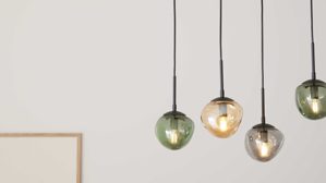 Mit der Hängelampe aus der Interliving Leuchten Serie 9350 bringst du ein echtes Design-Statement in deinen Wohnraum. Sechs organisch geformte, matte Glas-Lampenschirme in den Farbtönen Amber, Grün und Rauch sorgen für ein lebendiges Lichtspiel, während der mattschwarze Metallsockel und die schwarzen Textilkabel der Pendelleuchte einen modernen Look verleihen.