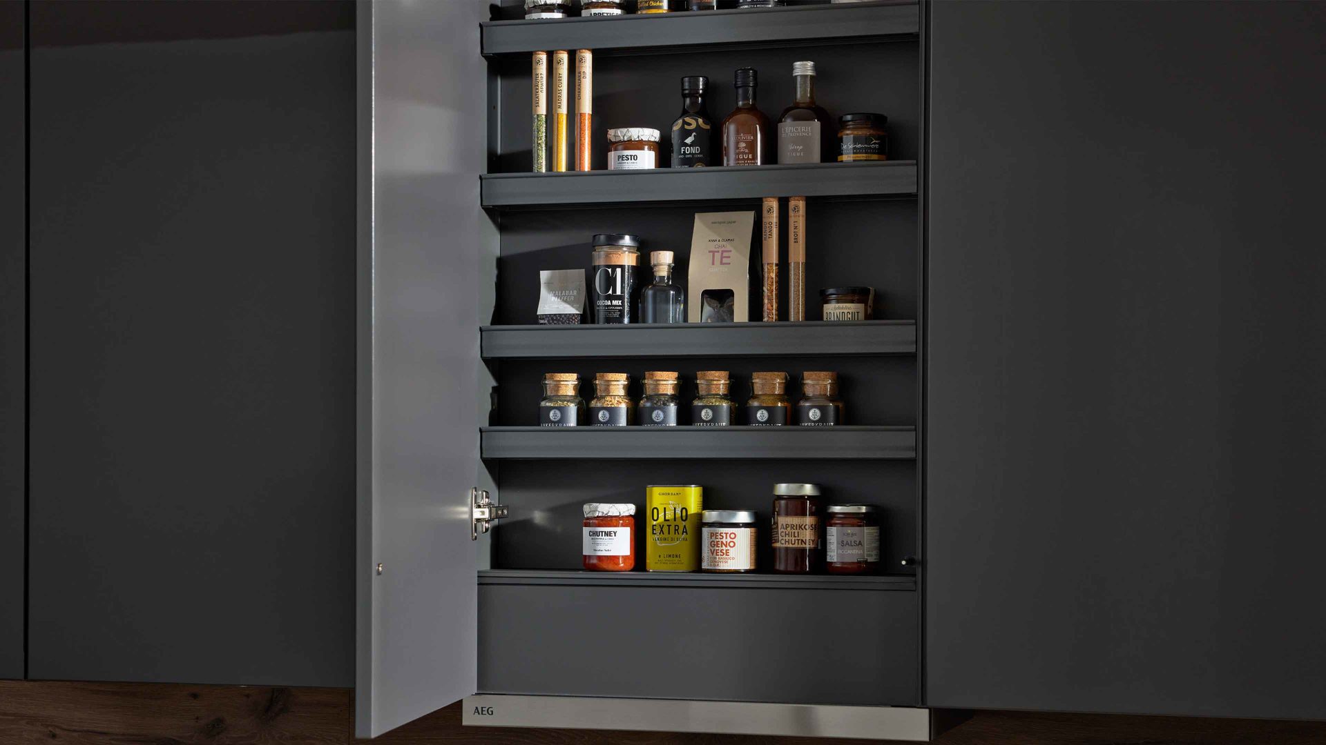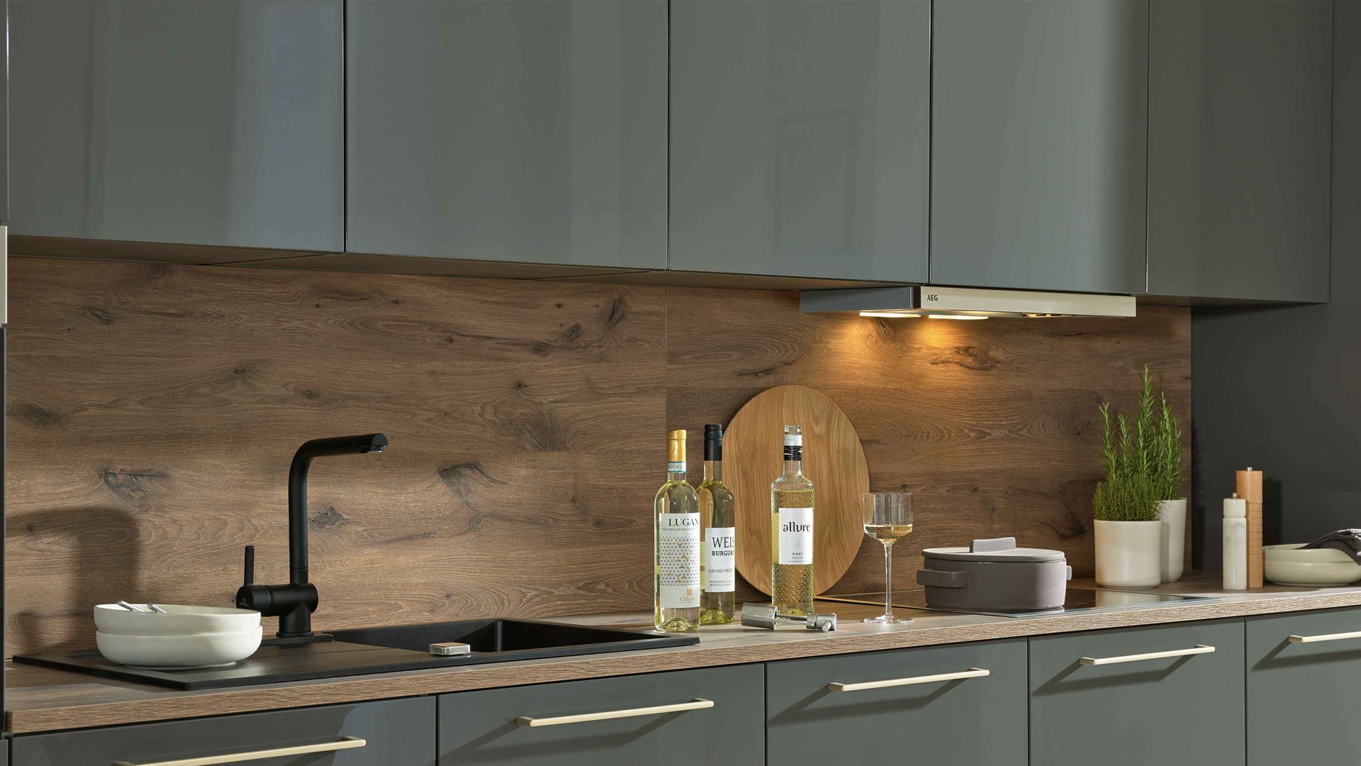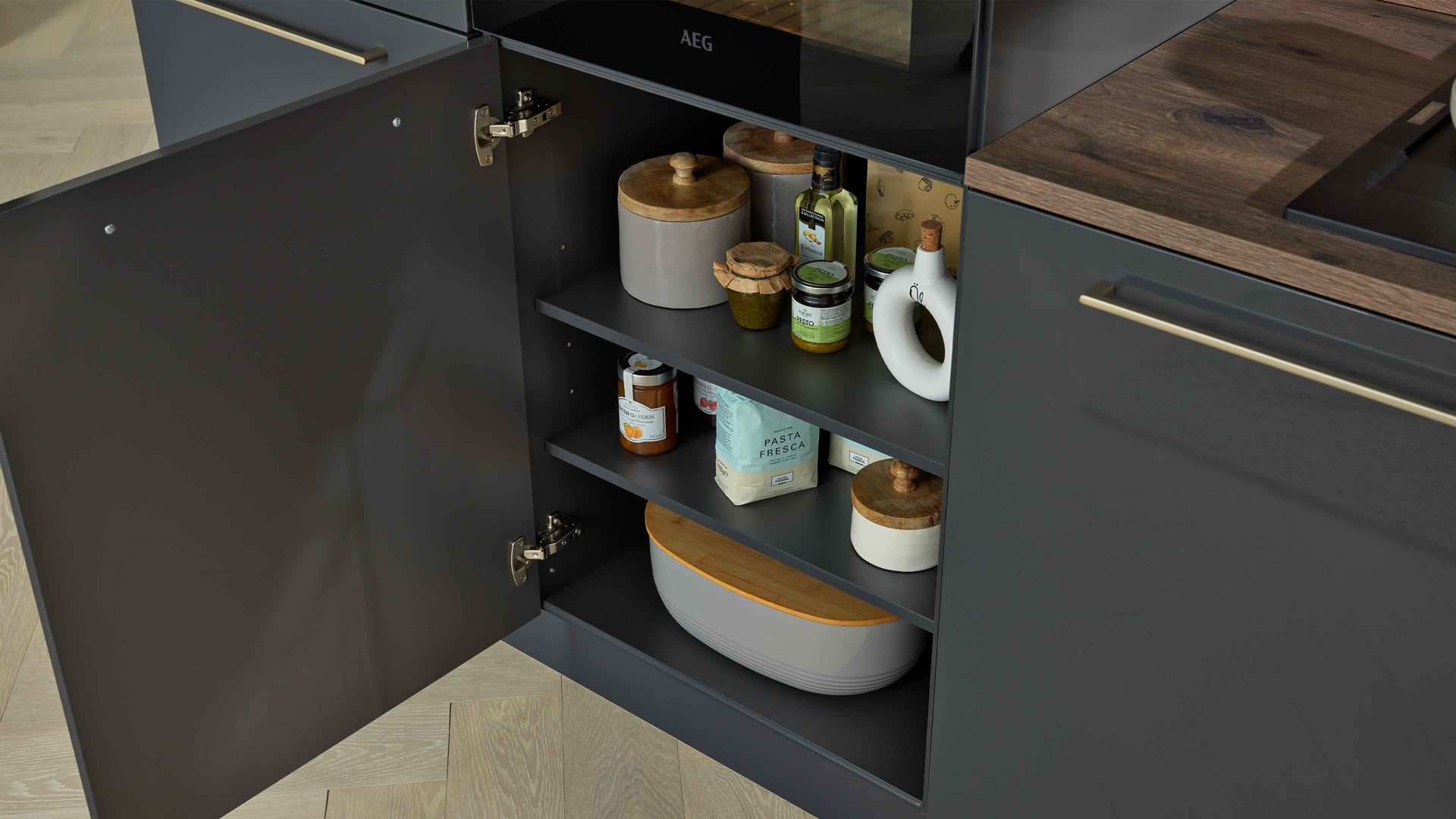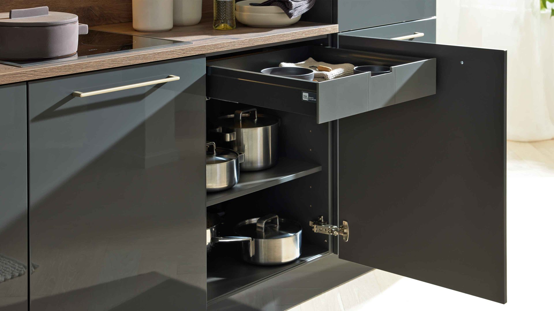 Interliving Küche Serie 3114 – moderne Hochglanzküche in Graphit mit AEG-Einbaugeräten