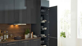 Die Interliving Küche Serie 3114 kombiniert graphitfarbene Hochglanzfronten mit warmen Akzenten in Castell-Eiche-Nachbildung. Ein graphitfarbener Korpus, glänzende graphitfarbene Sockelblenden und manganbronzefarbene Griffleisten runden das harmonische Gesamtbild ab. Besonders eindrucksvoll wirkt die holzfarbene Nischenverkleidung, die der Küche eine elegante und natürliche Note verleiht.