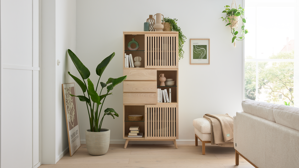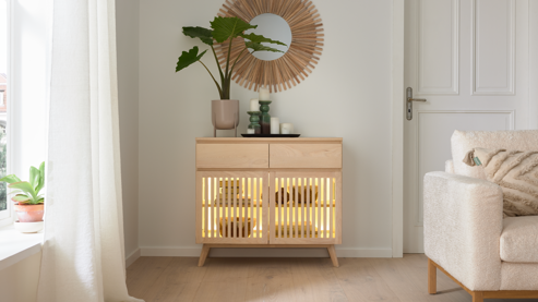Rückwand hinter den Lamellen-Türen mit LED-Beleuchtung (Beleuchtung warmweiß)