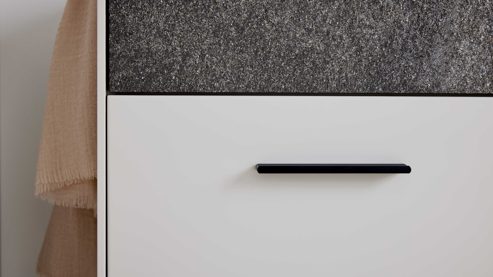 Wie bei allen Möbelstücken der Serie sorgen Softclose-Technologie bei den Türen und Selbsteinzug bei den Schubladen für leises, komfortables Handling. Die fertig montierten Elemente lassen sich schnell und unkompliziert aufhängen und kombinieren – perfekt für deinen individuellen Eingangsbereich.