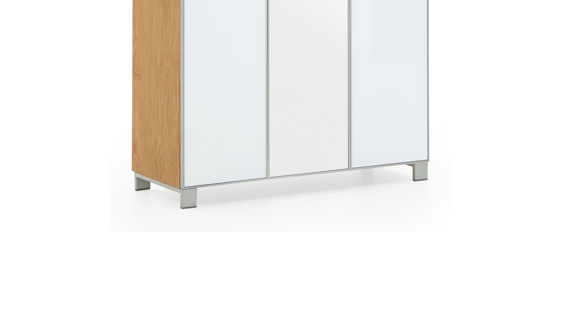 Modernes Design und Funktionalität gehen hier Hand in Hand. Der Garderobenschrank hat einen Eiche Bianco furnierten Korpus und optiweiße Glasfronten mit Spiegelauflage. Hinter der linken Holztür verstecken sich sieben Schuhgitter, die Stiefel, High Heels und Turnschuhe geschmackvoll aufbewahren, auf der anderen Seite erwartet Sie ein großes Fach, in dem Sie Jacken und Mäntel aufbewahren können.