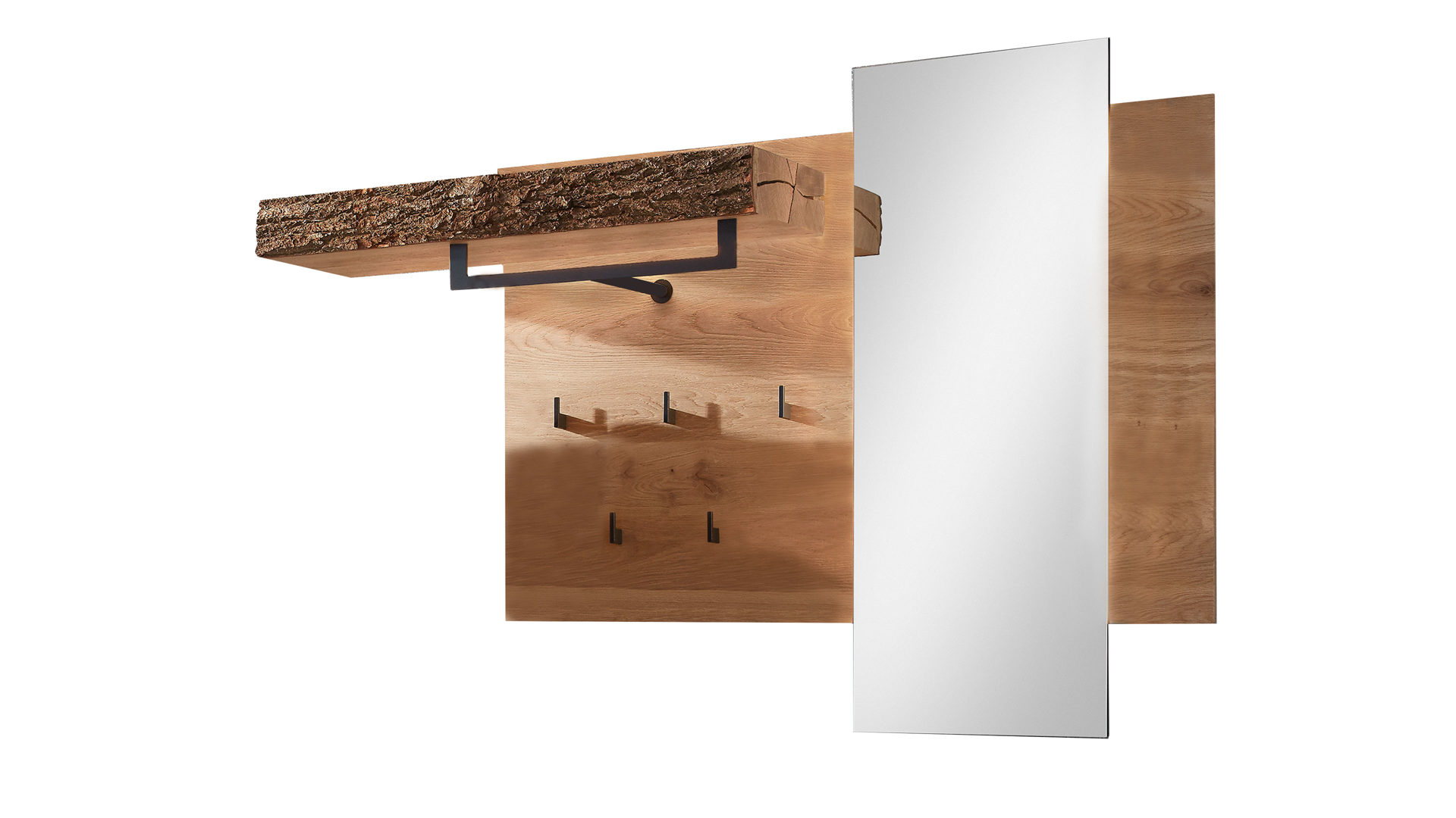 Die Schlüsselablage Runa verbindet eine Baumscheiben-Rückwand und anthrazitfarben pulverbeschichtetes Metall zu einem robusten, modernen und eindrucksvollen Ganzen. Durch die Baumscheibe bringt das kreative Schlüsselboard authentische Natürlichkeit in den Flur.