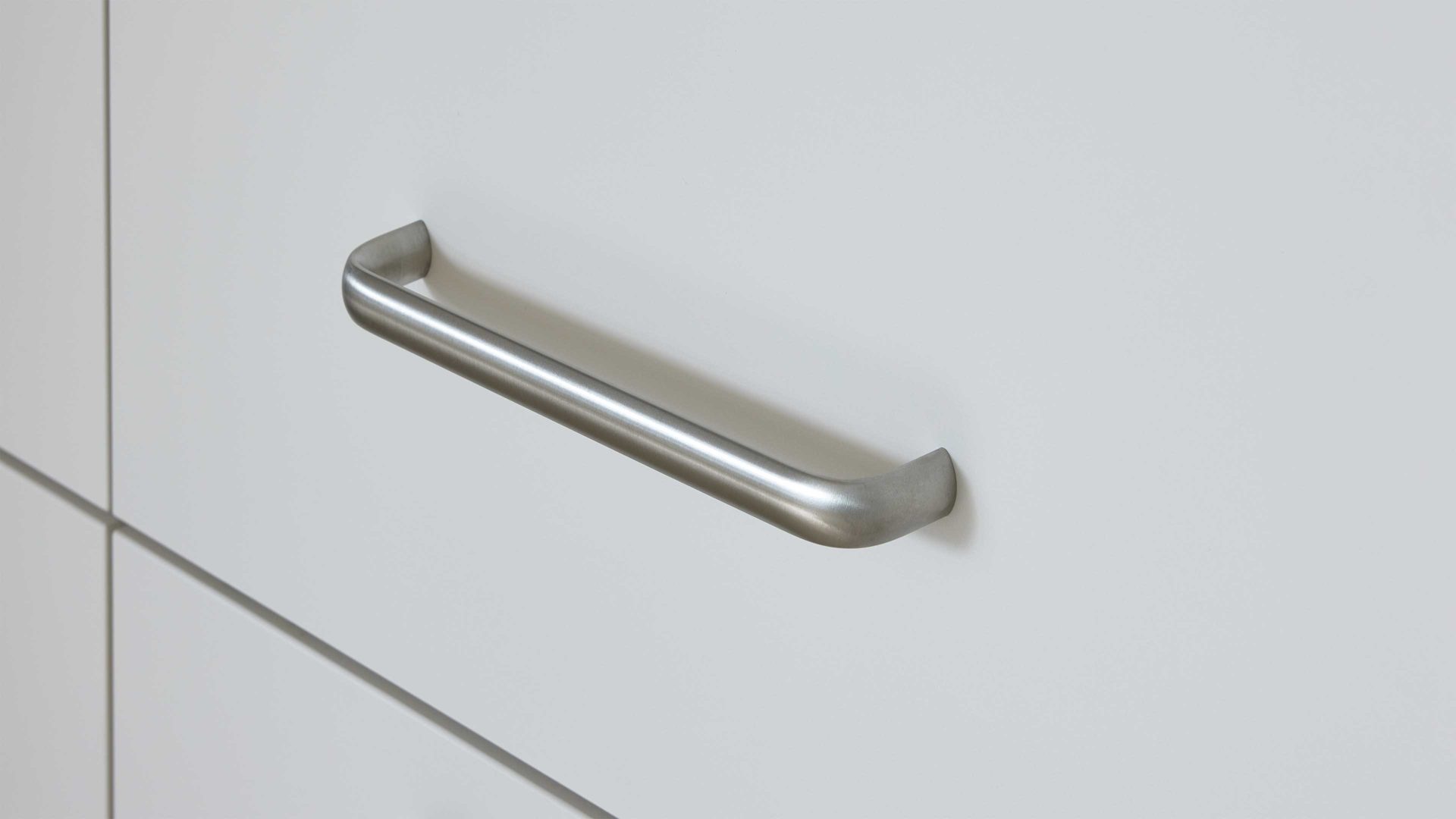 matte muschelweiße Fronten mit Edelstahl-Bügelgriffen und naturweiße Korpusse