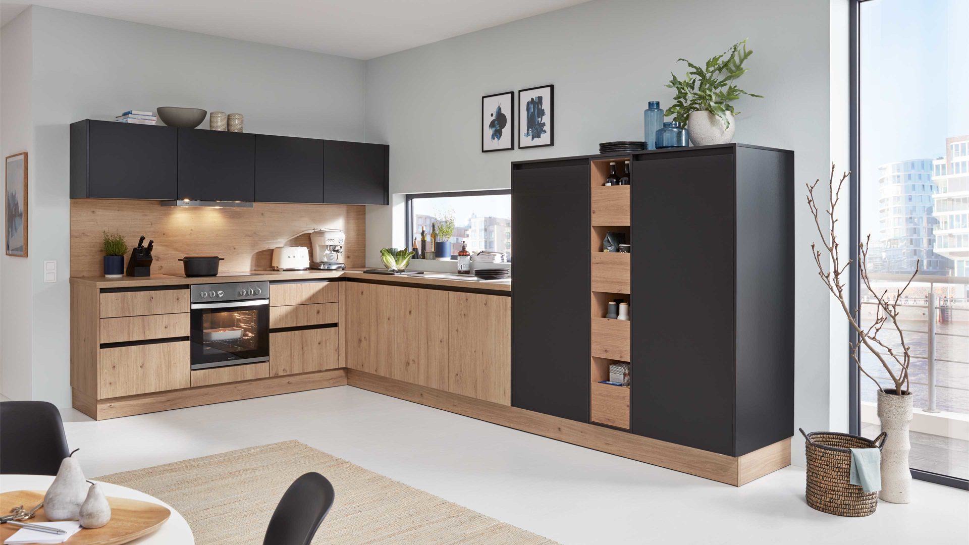 Bei der eleganten WERT KÜCHE® Barbara sind Korpus und Fronten wildeichefarben sowie matt-onyxschwarz gestaltet.
