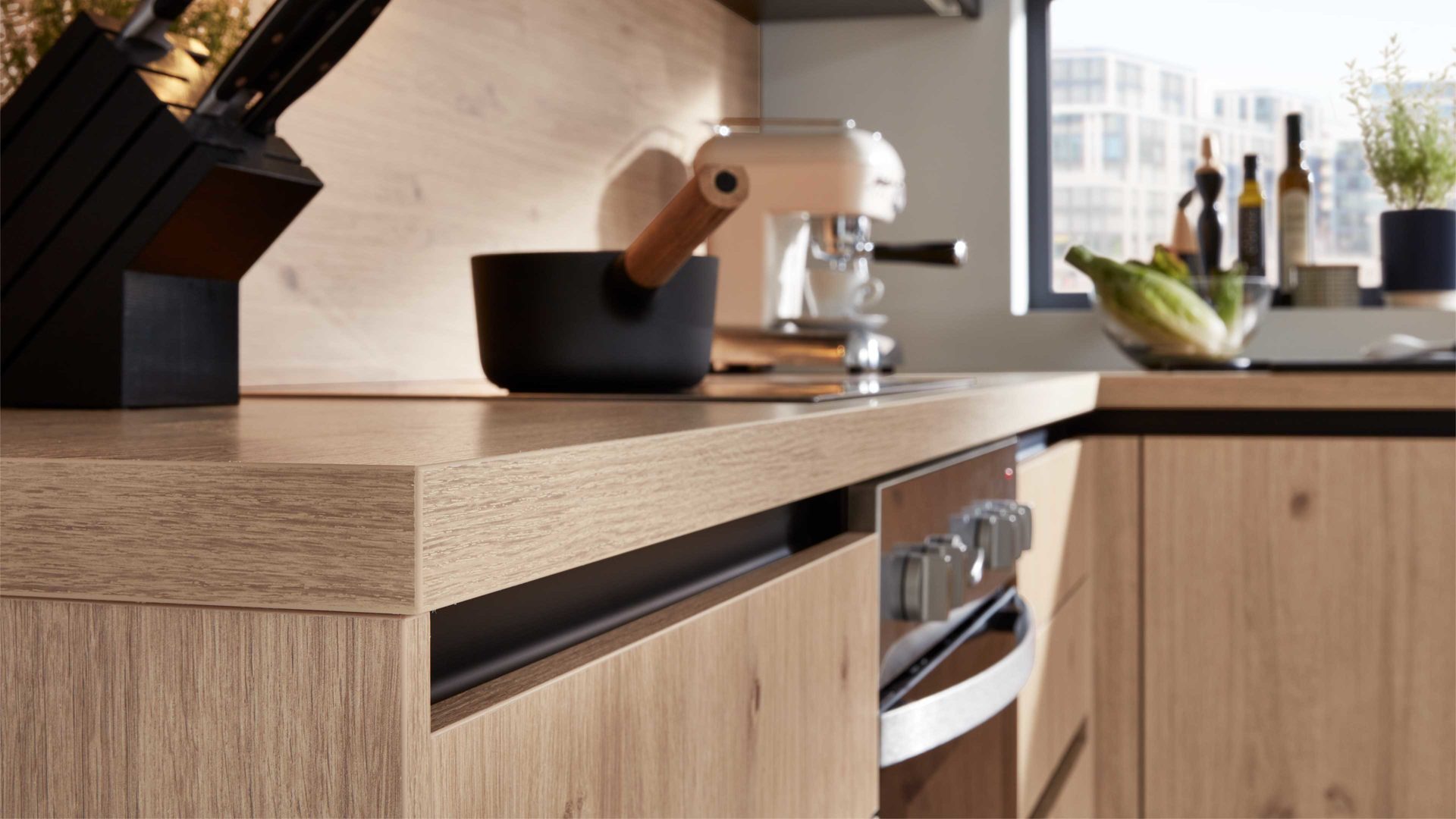 Die Arbeitsplatten und Sockelblenden greifen den Wildeicheton auf, während sich die Griffmulden wiederum in Onyxschwarz präsentieren. Durch die gelungene Farbkombination strahlt die Planküche natürlich-warm anmutenden und puristisch-klassischen Charme aus. Modern, kreativ und weit wirken die zum Teil grifflosen Fronten.