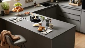 Die Einbauküche überzeugt durch ihre durchdachte U-Form mit extra dünnen, robusten XTRA CERAMIC Arbeitsplatten, die eine großzügige Arbeitsfläche und viel Stauraum bieten. Eine matt magmafarbene Einbauspüle wird zum dezenten Highlight, während offene Regalböden mit verspiegelter Rückwandverkleidung das Licht reflektieren und dem Raum Tiefe verleihen. So entsteht eine moderne, offene Küchenatmosphäre, die sowohl funktional als auch wohnlich ist.