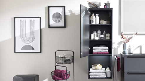 • Die Abbildung zeigt ein Wohnbeispiel, welches auch Dekoration sowie separat erhältliches Zubehör enthält. Im Lieferumfang enthalten sind ein Waschbecken und ein Unterschrank.