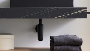 Zwei mattschwarze Kunststoff-Siphons (Typ 17700) mit Wandrosetten komplettieren das Set. Mit kompakten Maßen von je ca. 30 x 22 cm (HxT) sorgen sie für eine platzsparende Installation und ein einheitlich modernes Gesamtbild – ideal für stilvolle Waschtischlösungen mit Konsole.
