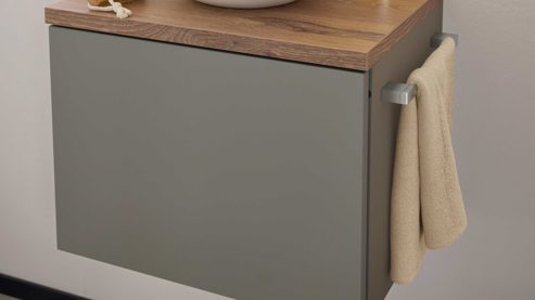 Die Kombination aus taupegrau lackierter Lacklaminatfront, taupegrauem Korpus und einem Abdeckboden in Viking Oak-Nachbildung wirkt ruhig, hochwertig und zeitlos. So schaffst du selbst im Gäste-WC eine harmonische, moderne Atmosphäre.