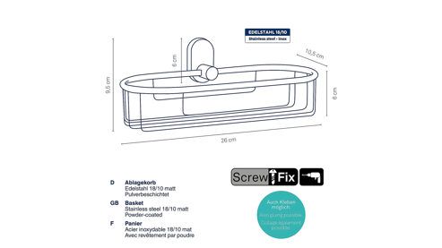 Organisiert und elegant: Unser schwarzer Edelstahl-Dusch-Ablagekorb Alessio ist die Lösung für die Dusche! Hergestellt aus hochwertigem Edelstahl mit mattem Finish, bietet er genug Platz für all die Duschutensilien des Alltags. Einfach zu montieren mit beiliegenden Schrauben. Bestellen Sie jetzt. Maße ca. 26 x 10 x 11 cm (BxHxT)