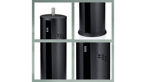 Für den Toilettenpapier-Nachschub: der Toilettenpapierbehälter SWING aus pulverbeschichtetem Metall in der Farbe matt schwarz, für bis zu drei WC-Papierrollen. Die seitliche Öffnung ermöglicht das einfache Entnehmen und Befüllen des Toilettenpapiers. Der Toilettenpapierbehälter hat einen Durchmesser von ca 15 cm und ist ca. 40 cm hoch.