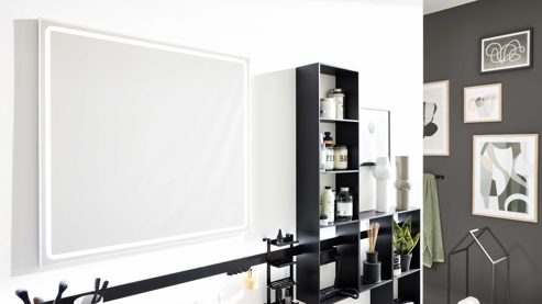 Der ca. 80 x 72 x 3 cm (B/LxHxT) große Wandspiegel (Typ 15281) bringt modernes Licht ins Bad. Umlaufend sandgestrahlte LED-Lichtfenster (ca. 12 mm), 30 Watt, 5700 Kelvin, fest verbaute Leuchtmittel, Spiegelheizung und Touchsensor garantieren höchsten Komfort. Energieeffizienzklasse F (Spektrum A bis G), Schutzklasse IP44.