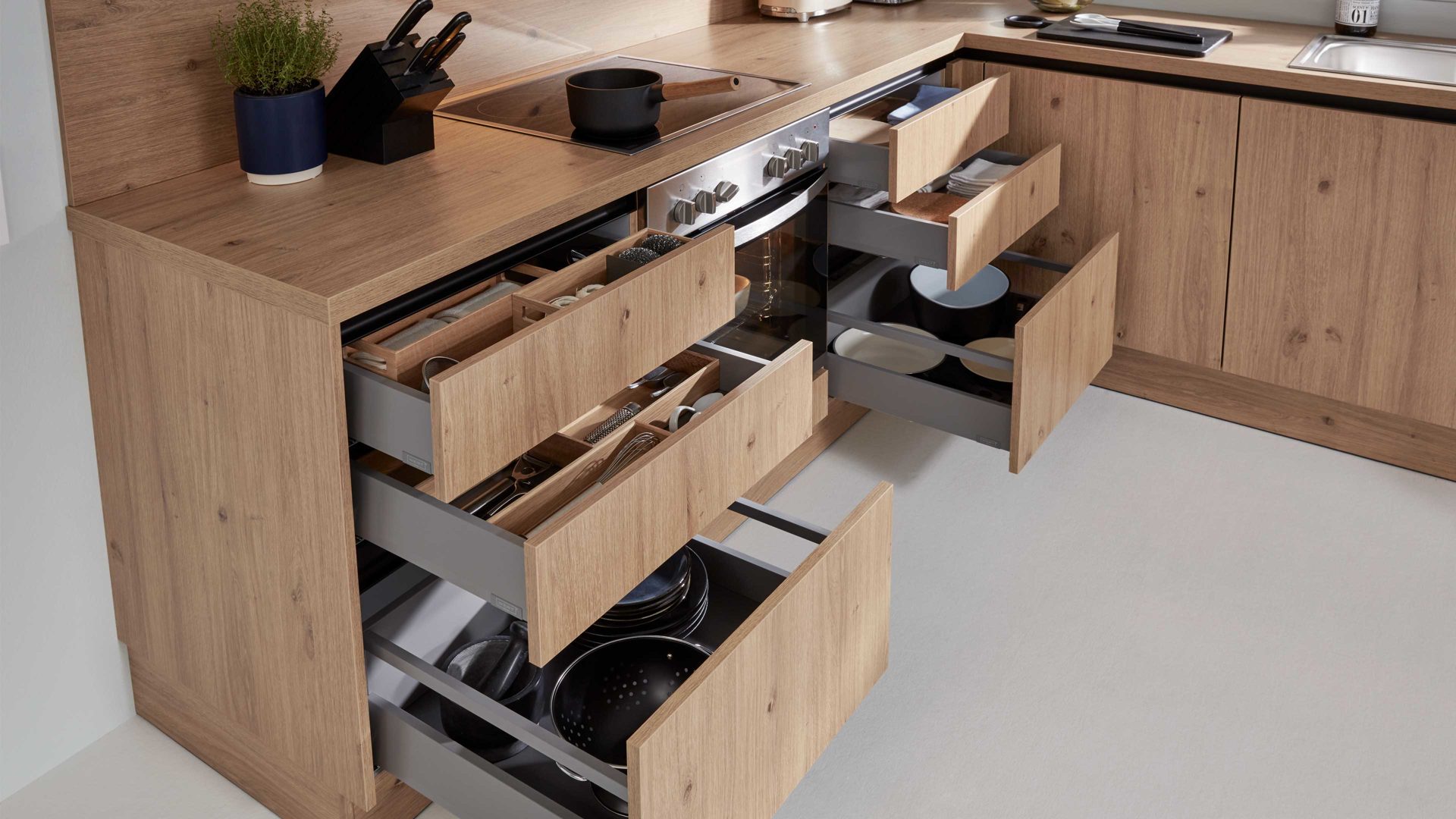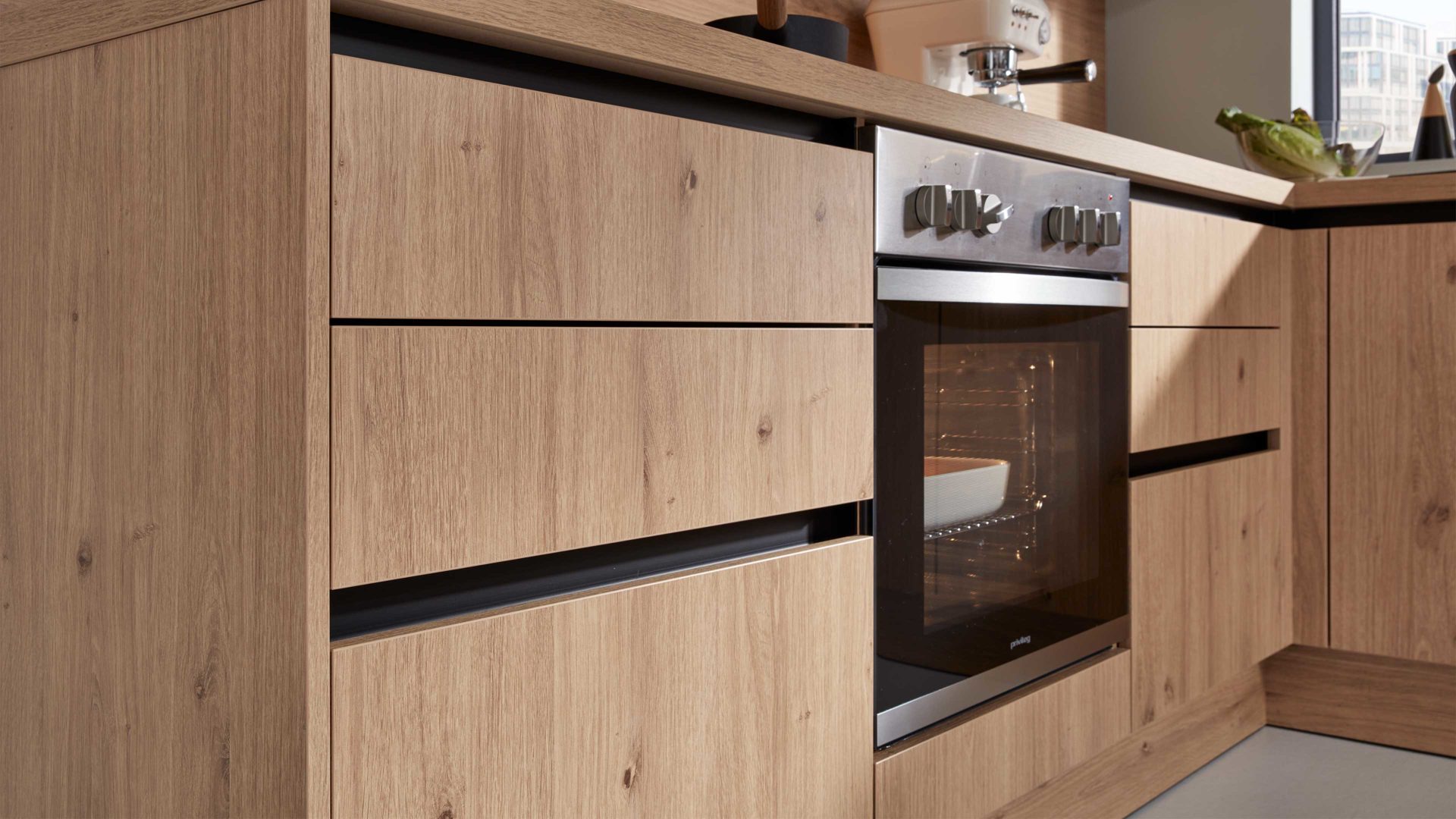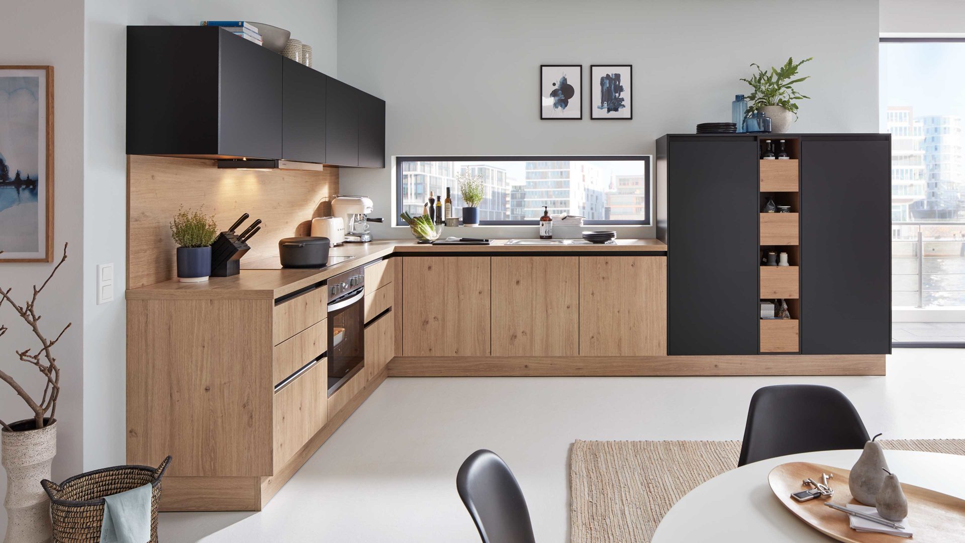 Die Arbeitsplatten und Sockelblenden greifen den Wildeicheton auf, während sich die Griffmulden wiederum in Onyxschwarz präsentieren. Durch die gelungene Farbkombination strahlt die Planküche natürlich-warm anmutenden und puristisch-klassischen Charme aus. Modern, kreativ und weit wirken die zum Teil grifflosen Fronten.
