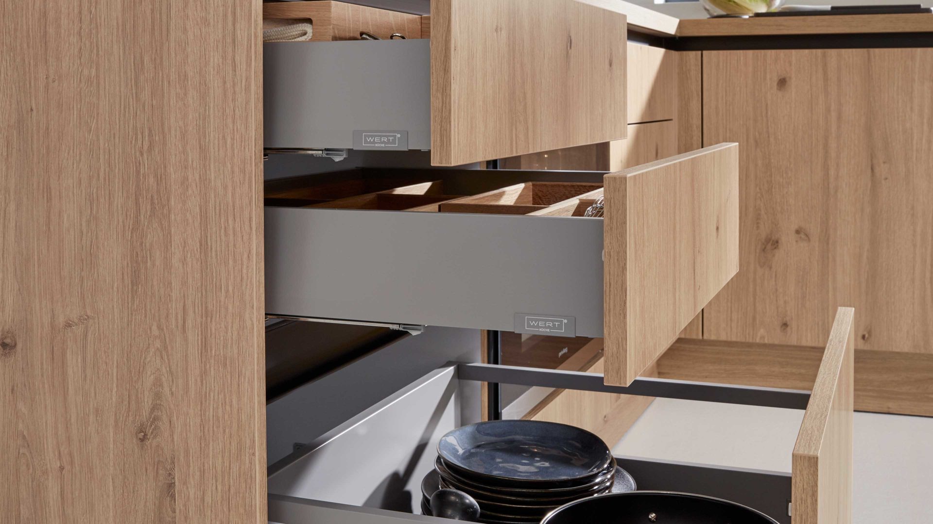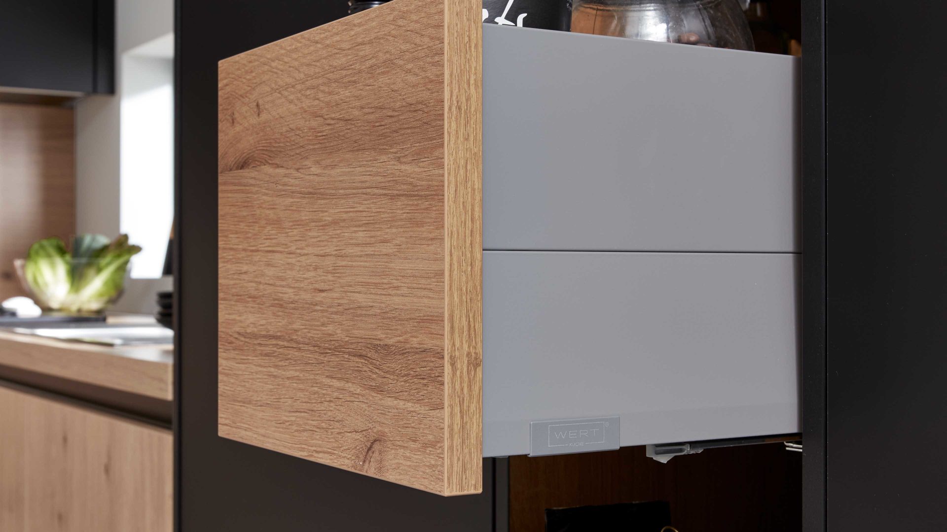 Bei der eleganten WERT KÜCHE® Barbara sind Korpus und Fronten wildeichefarben sowie matt-onyxschwarz gestaltet.