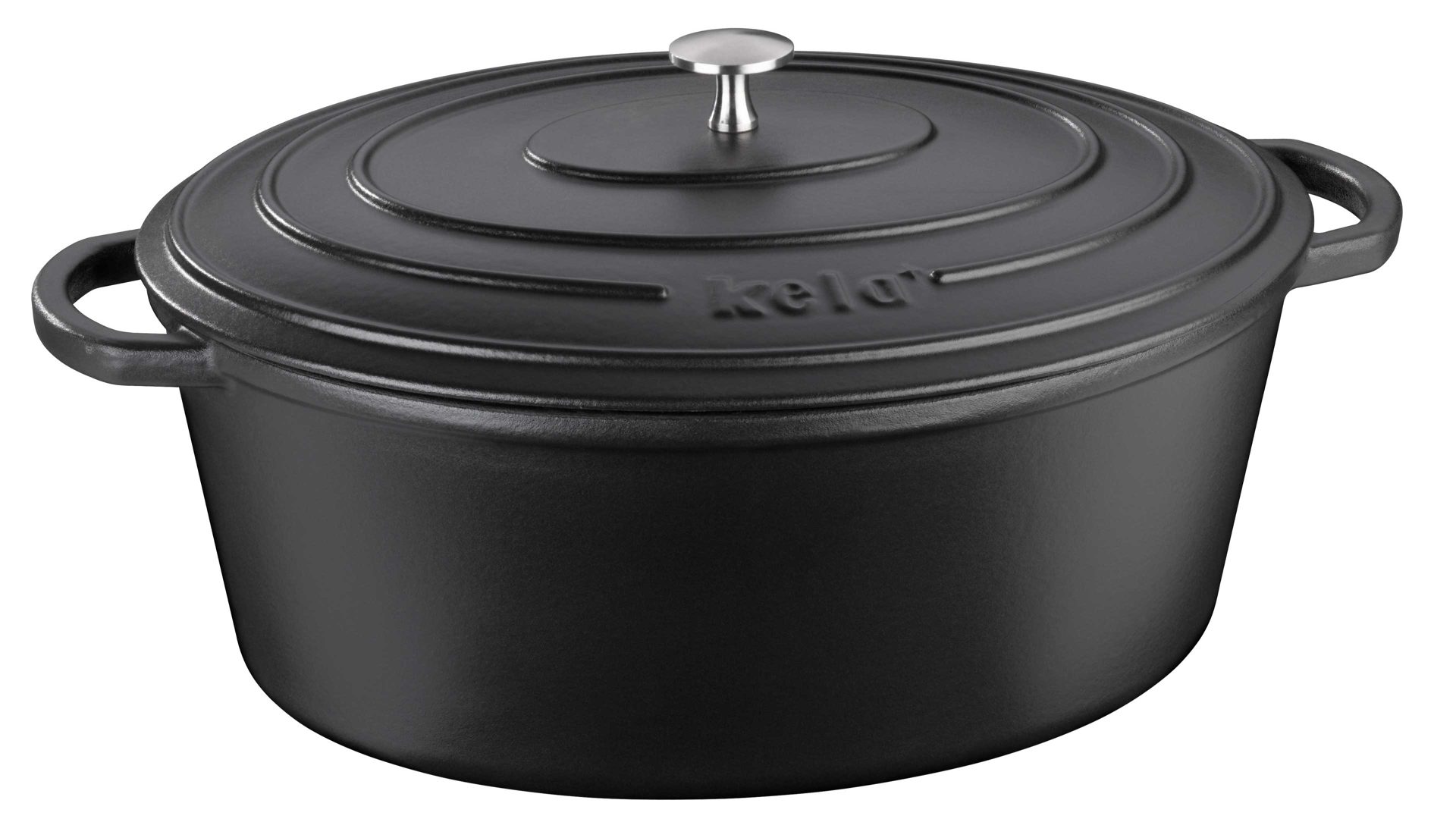 kela Bräter Calido | Gusseisen mit schwarzer Emaille-Beschichtung innen und außen | Größe ca. 36 x 15 x 29 (BxHxT) | Bodenfläche ca. 29 x 20 cm (BxL) | Inhalt ca. 9,3 Liter | Edelstahl-Deckelknopf | große Griffe | einfache Reinigung | gleichmäßige Hitzeverteilung | gute Wärmespeicherung | energiesparend | perfekt für Anbraten und Schmoren | backofenfest bis 300 Grad Celsius | für alle Herdarten geeignet, auch für Induktion | zehn Jahre Hersteller-Qualitätsgarantie | in verschiedenen Farben und Größen bestellbar