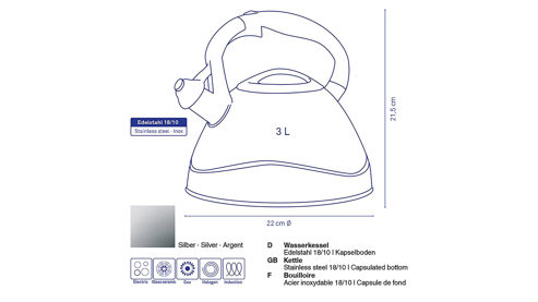 Traditioneller Wasserkessel aus Edelstahl mit Kapselboden, welcher sich für alle Herdarten eignet. Der Griff ist rutschfest und hat den Öffner zum Ausgießen des heißen Wassers praktisch integriert, sodass man nicht mit dem heißen Wasserdampf in Berürung kommt. Durchmesser ca. 22 cm, Fassungsvermögen 3 Liter, Farbvariante: Rot.